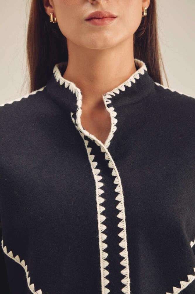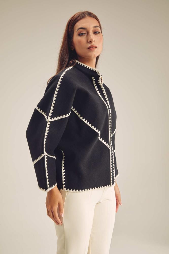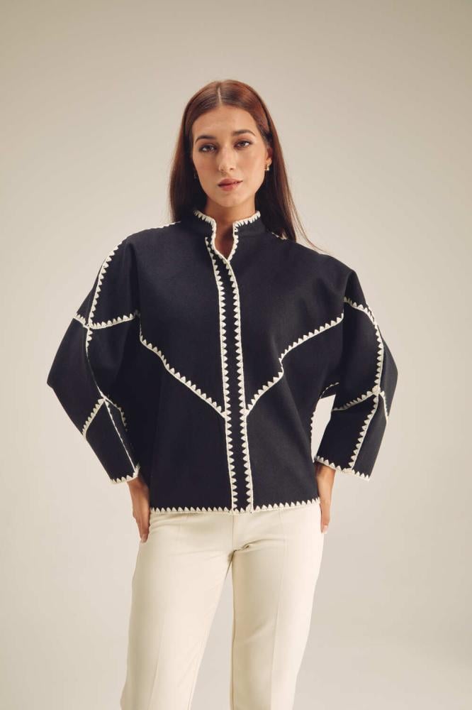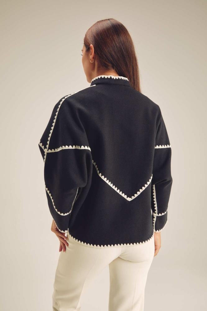 احصلي على إطلالة أنيقة في الأجواء الباردة مع هذا الجاكيت العصري ، مصمم بقصة فضفاضة ،بتصميم بياقة مستديرة وبأكمام طويلة ويأتي بأزرار كبس للإغلاق