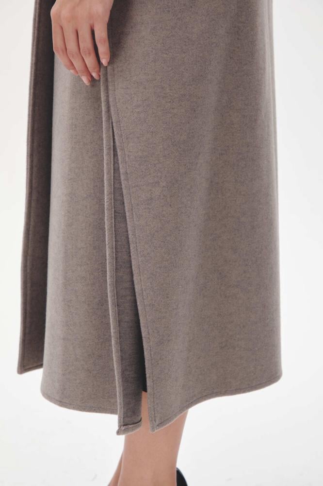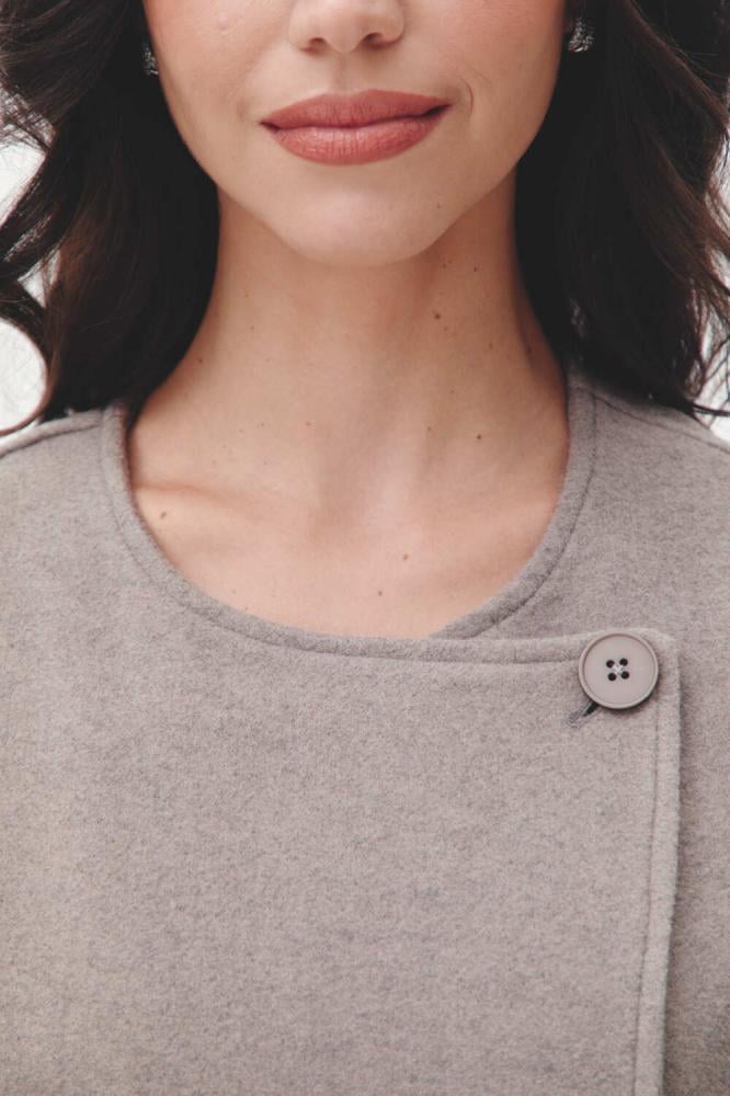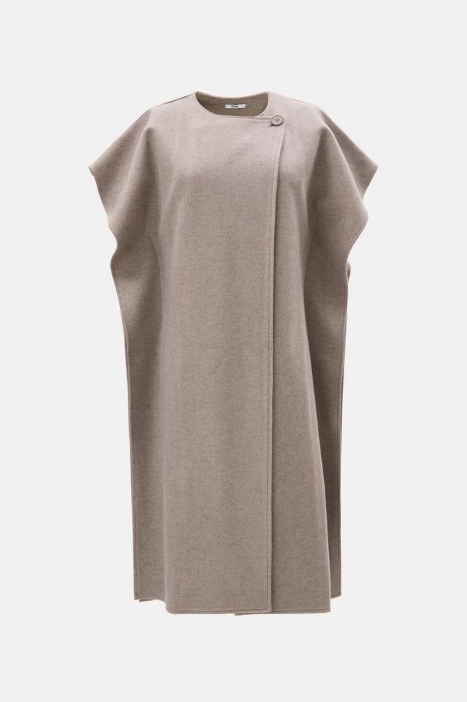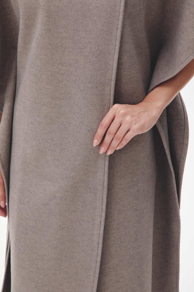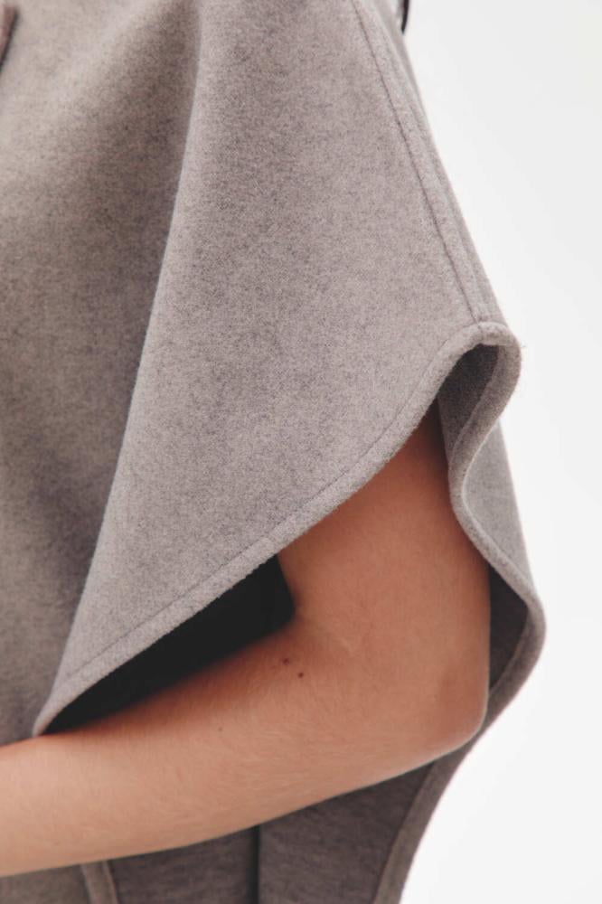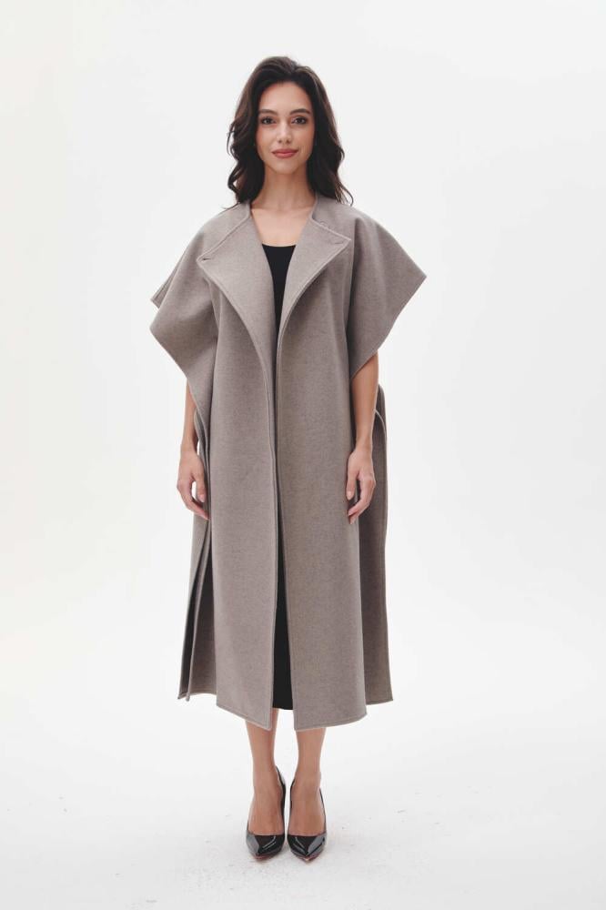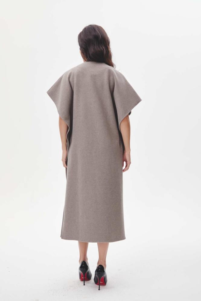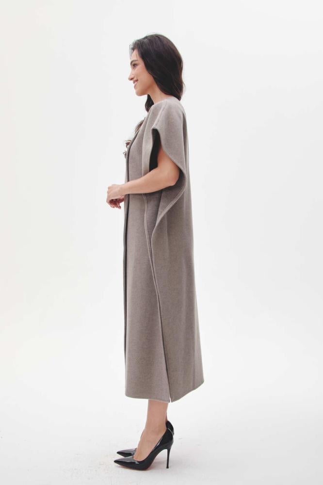 معطف كيب بطول ميدي، بأكمام قصيرة وزر إغلاق يضفي لمسة عصرية وأنيقة، مع فتحات جانبية تضيف لمسة من الراحة والحركة.