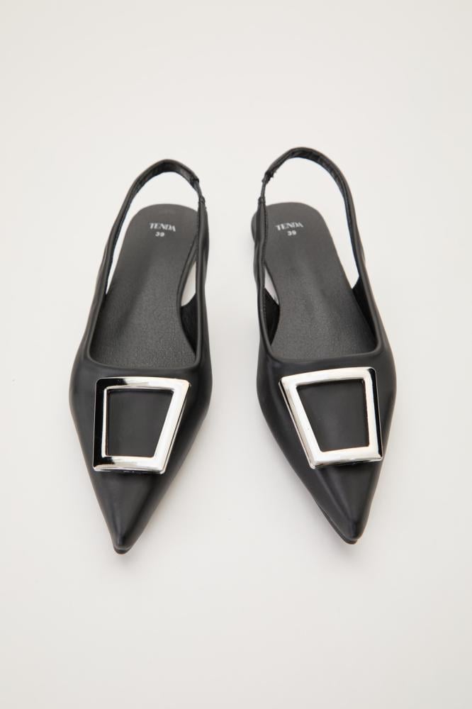 استمتعي بالرقي مع هذا الحذاء الكلاسيكي بزينة معدنية وحزام خلفي ، ويتميز بتصميم أنيق يوفر الأناقة والراحة. مثالي لأي مناسبة