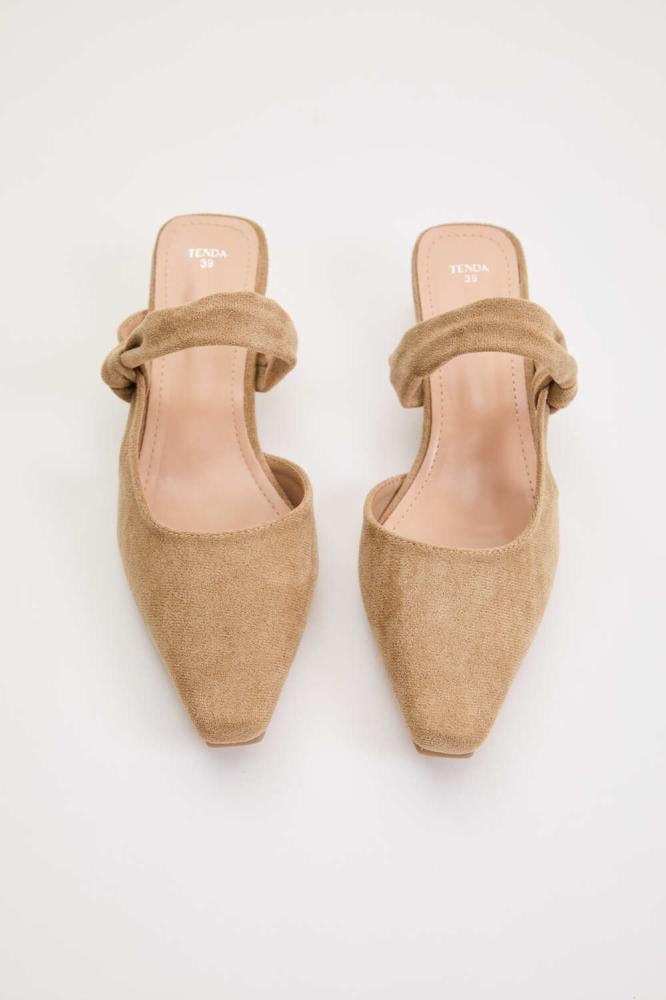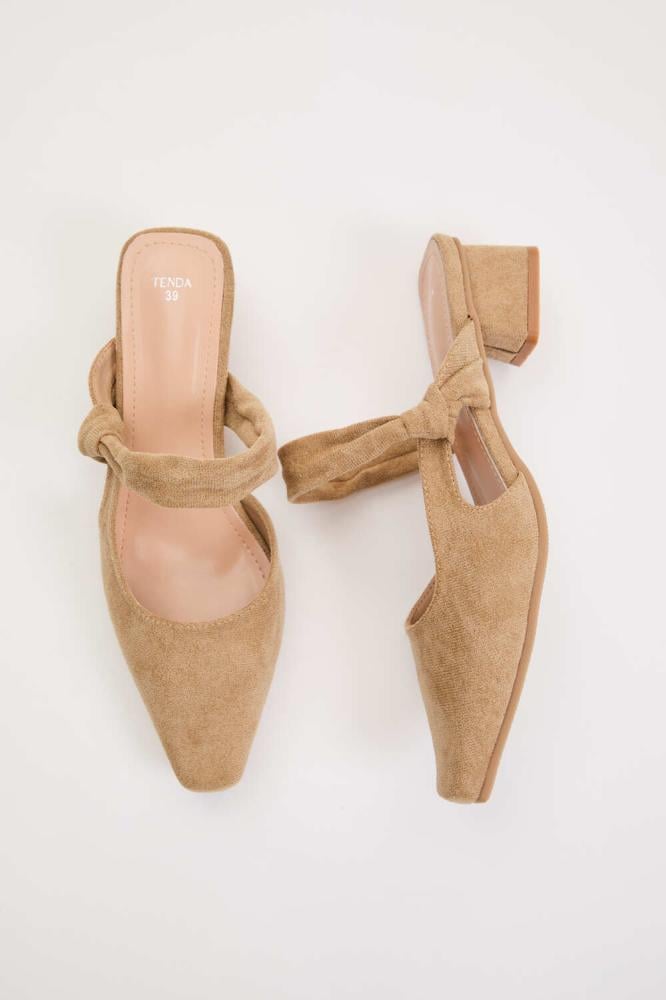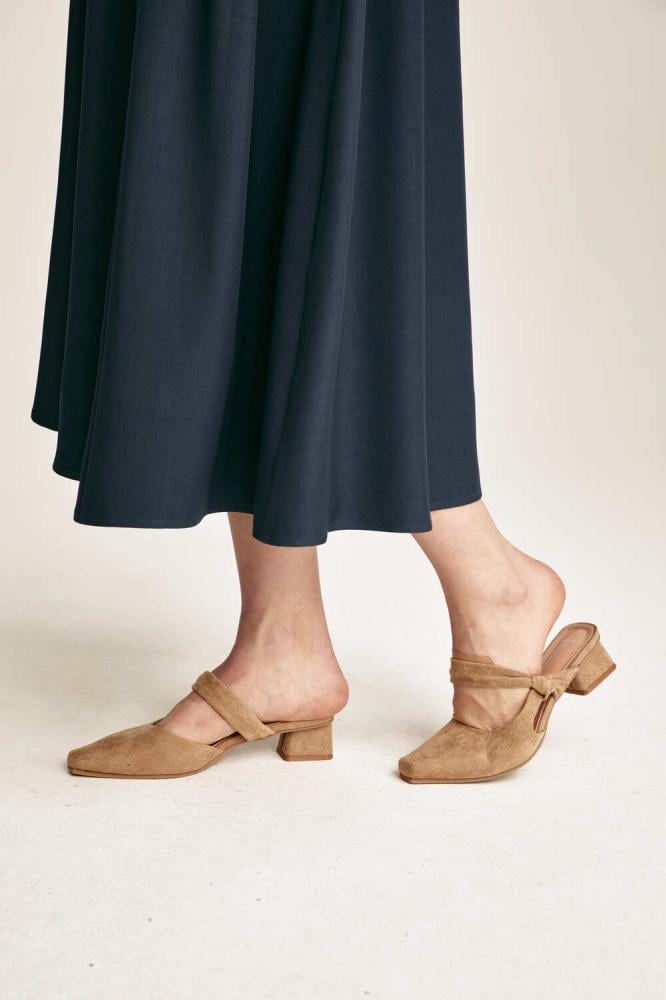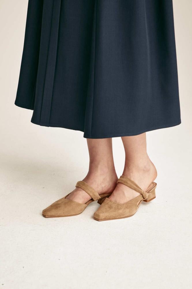 حذاء مفتوح من الخلف بتصميم كلاسيكي سهل الارتداء كما يتميز بخامة شامواة ونعل مربع ، يمكن تنسيقه مع بنطال بقصة ساق واسبعة أو فستان بسيط لإبراز روعة تصميمه.