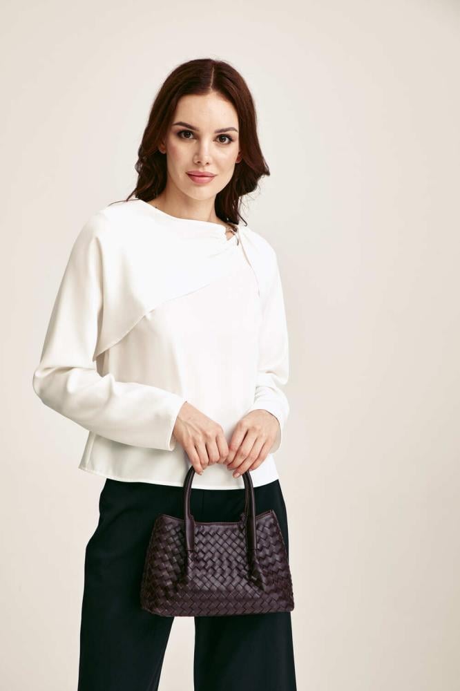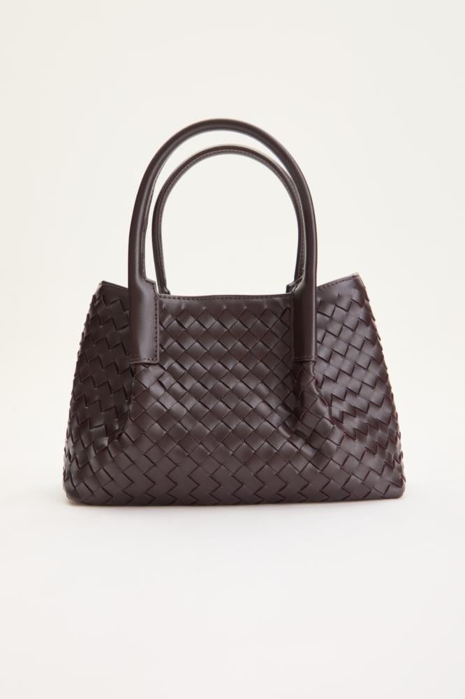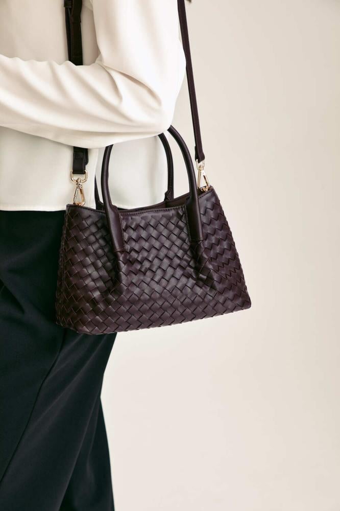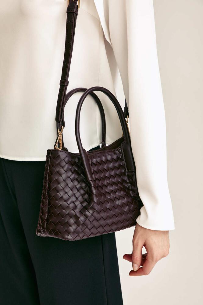 حقيبة جلد منسوجة بتفاصيل راقية، مزوّدة بحزام قابل للفصل ومقبض مزدوج لخيارات حمل متعددة.
