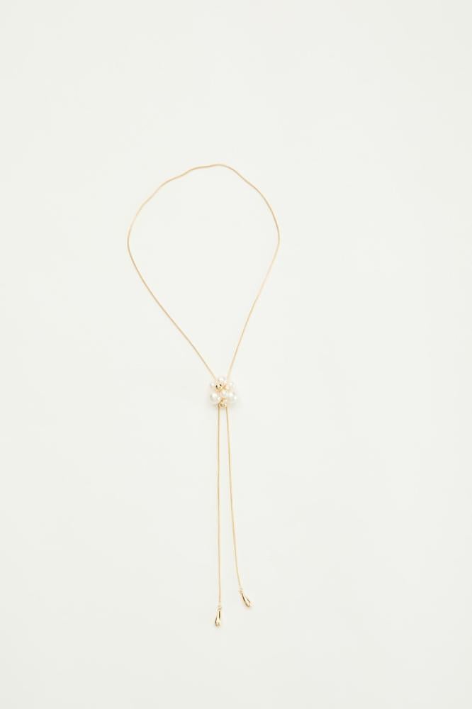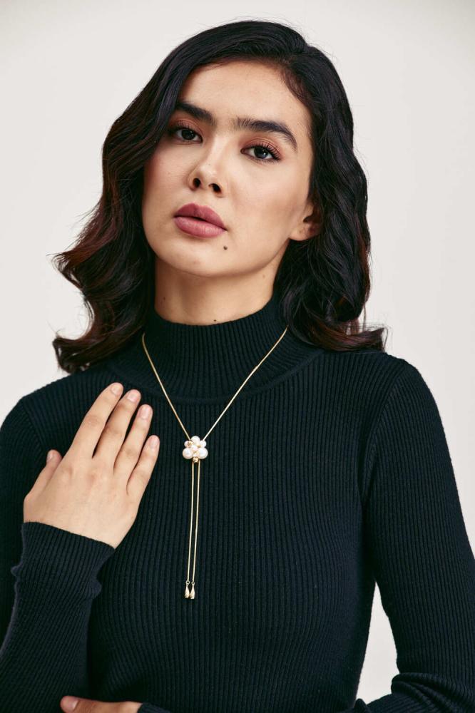 سلسال ذهبي بتصميم رفيع وأنيق، بتعليقة قابلة للتعديل على شكل وردة مزينة باللؤلؤ والأحجار البراقة خيار مثالي لإضافة لمسة رومانسية ناعمة لإطلالتك اليومية أو المسائية.
