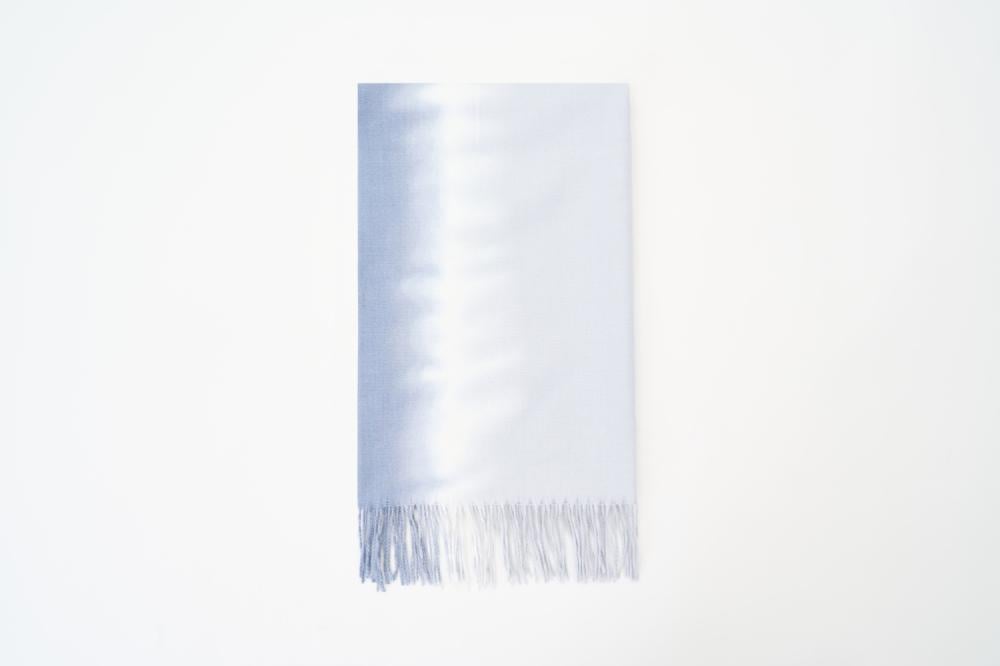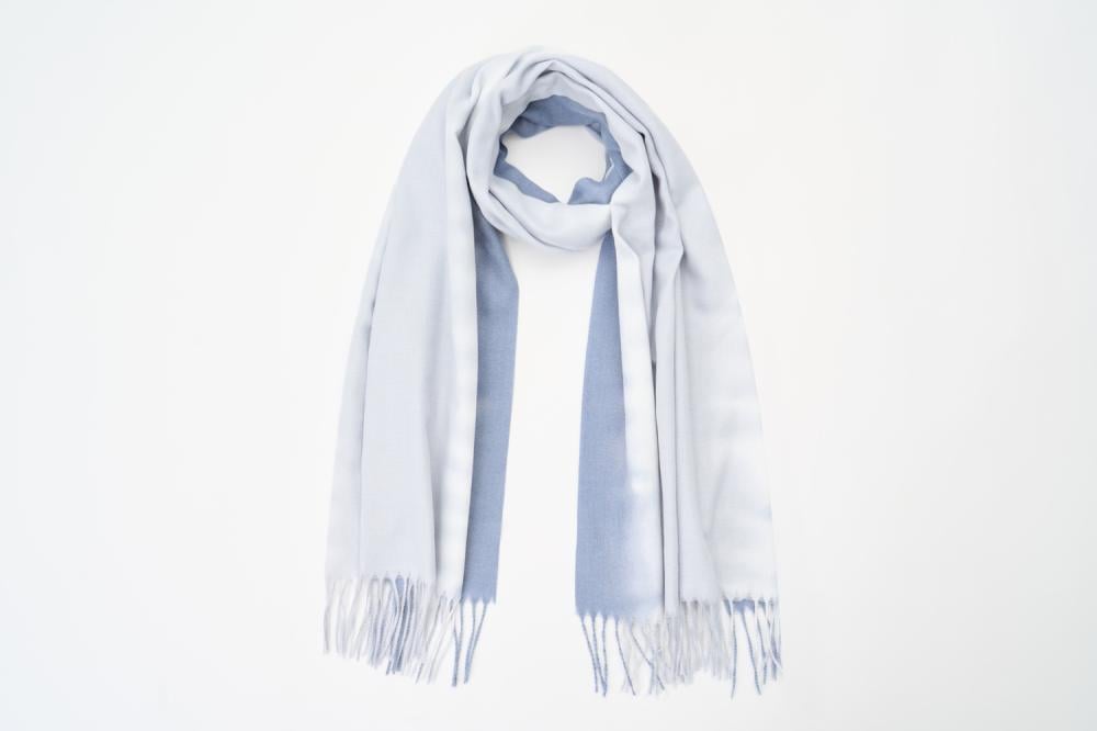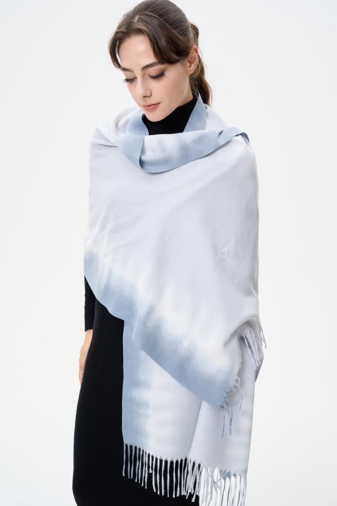 وشاح شتوي بشراشيب بتدرجات اللون الأزرق ،مثالي لإطلالة شتوية مميزة. تصميم مستطيل لخيارات تنسيق متعددة