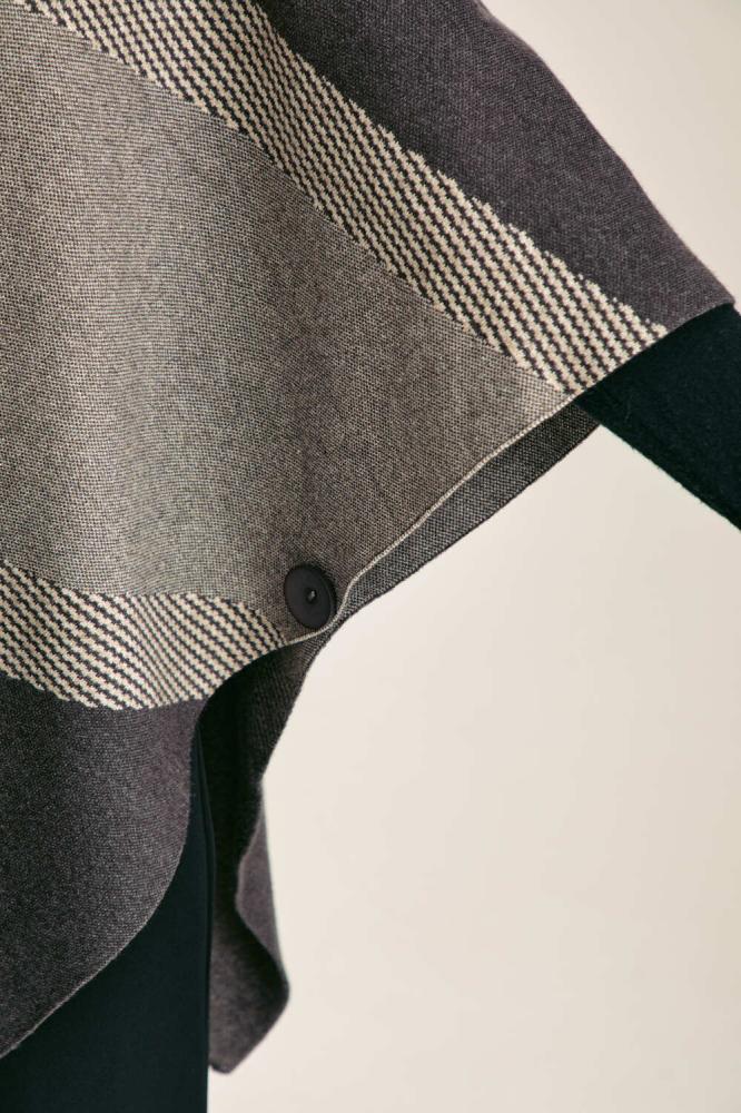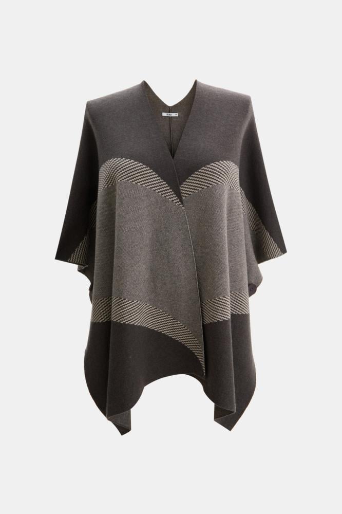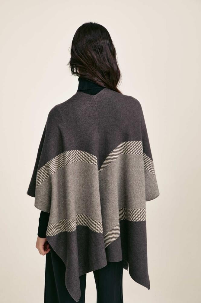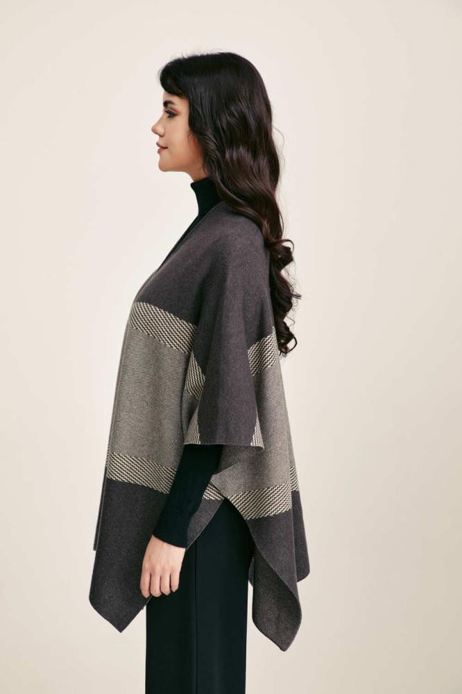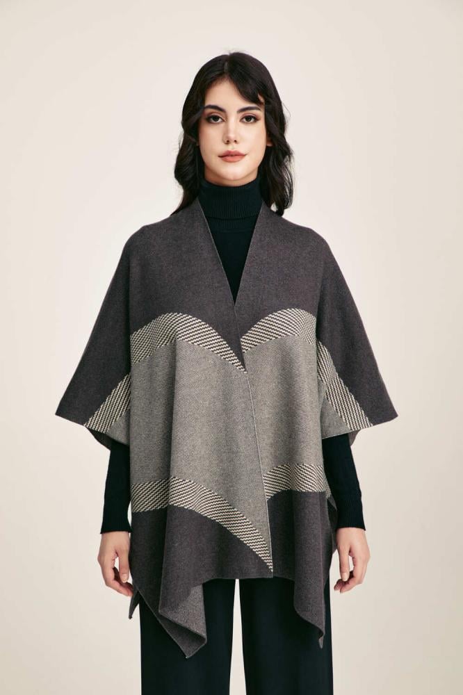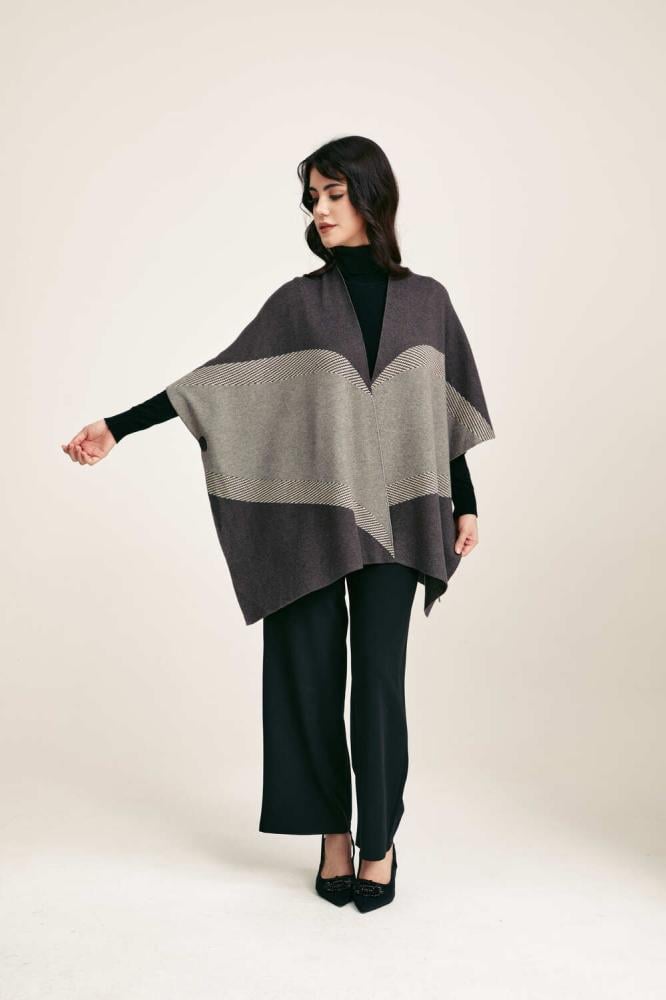 كيب بونشو أنيق باللون الرمادي مزين بخطوط متعرجة ، تصميم انسيابي يمنحك دفء الشتاء بلمسة راقية تناسب إطلالاتك اليومية.
