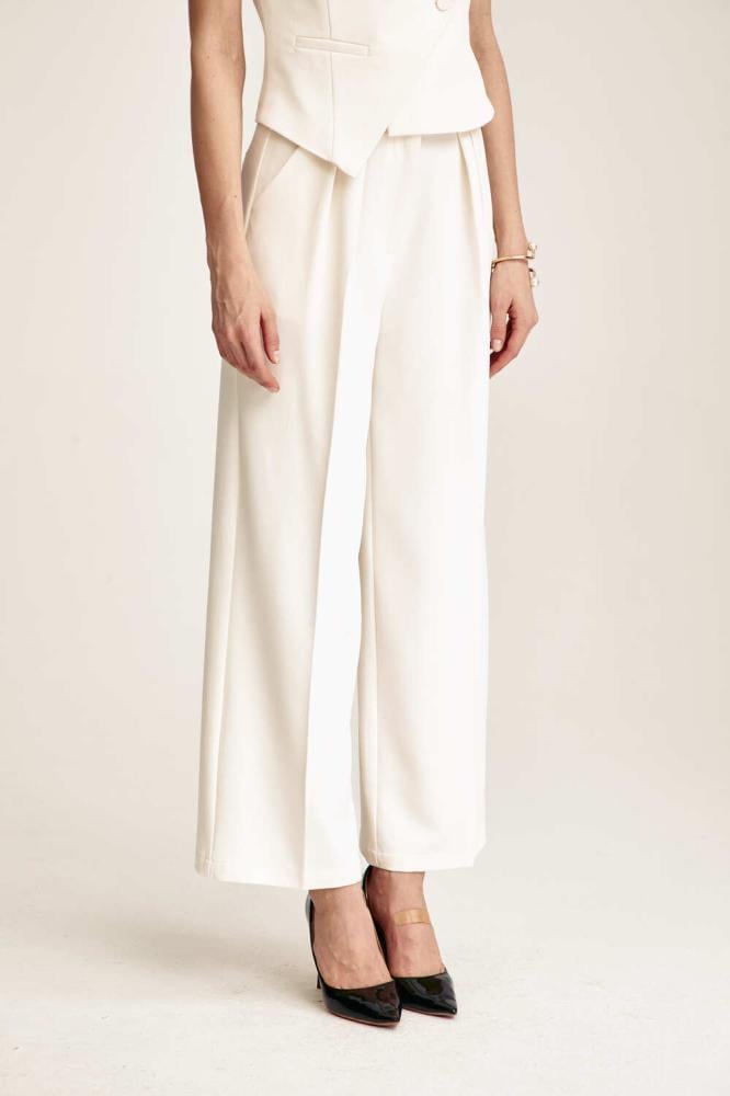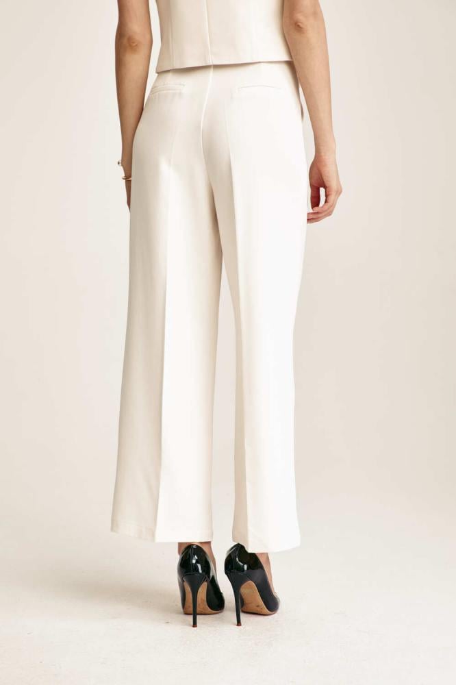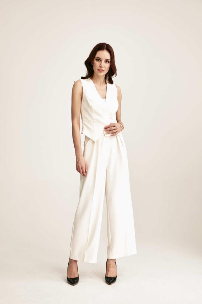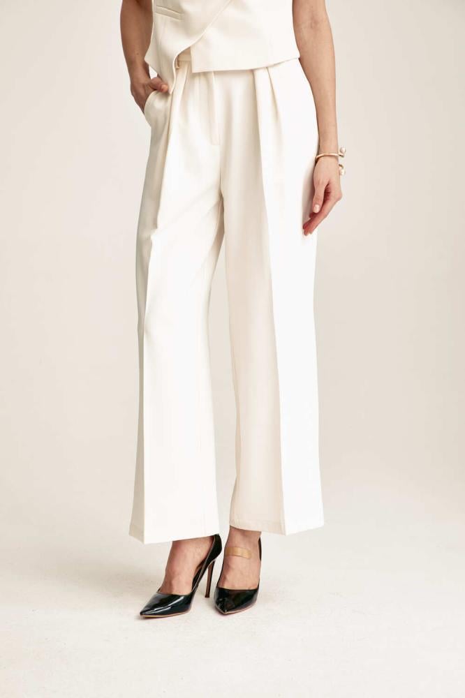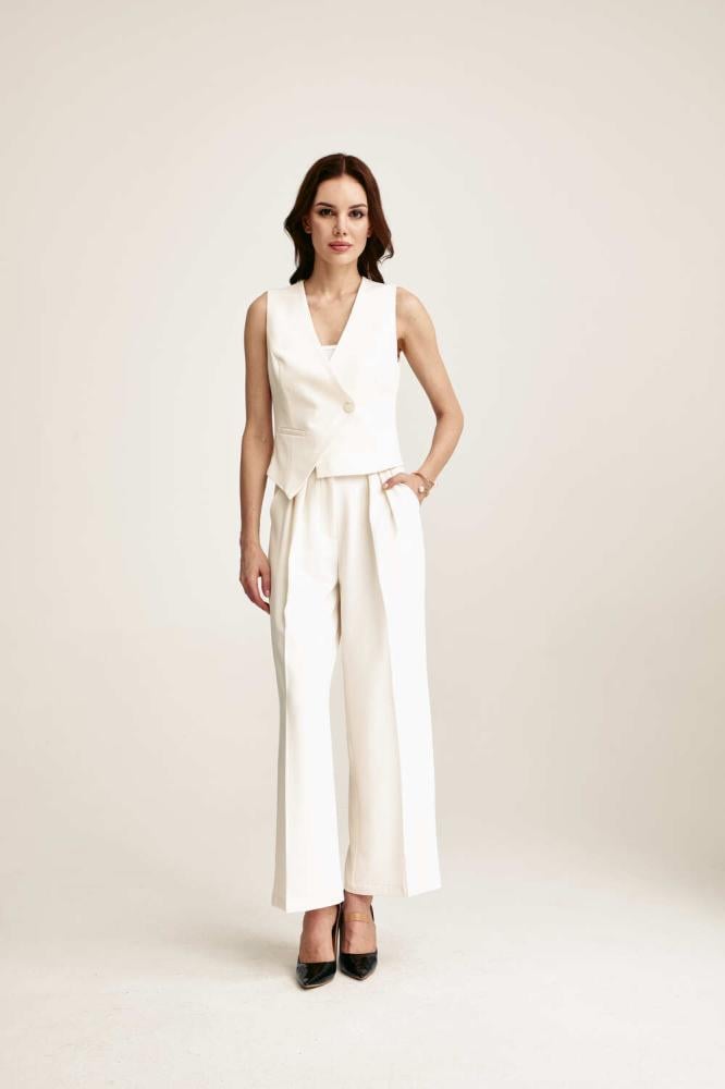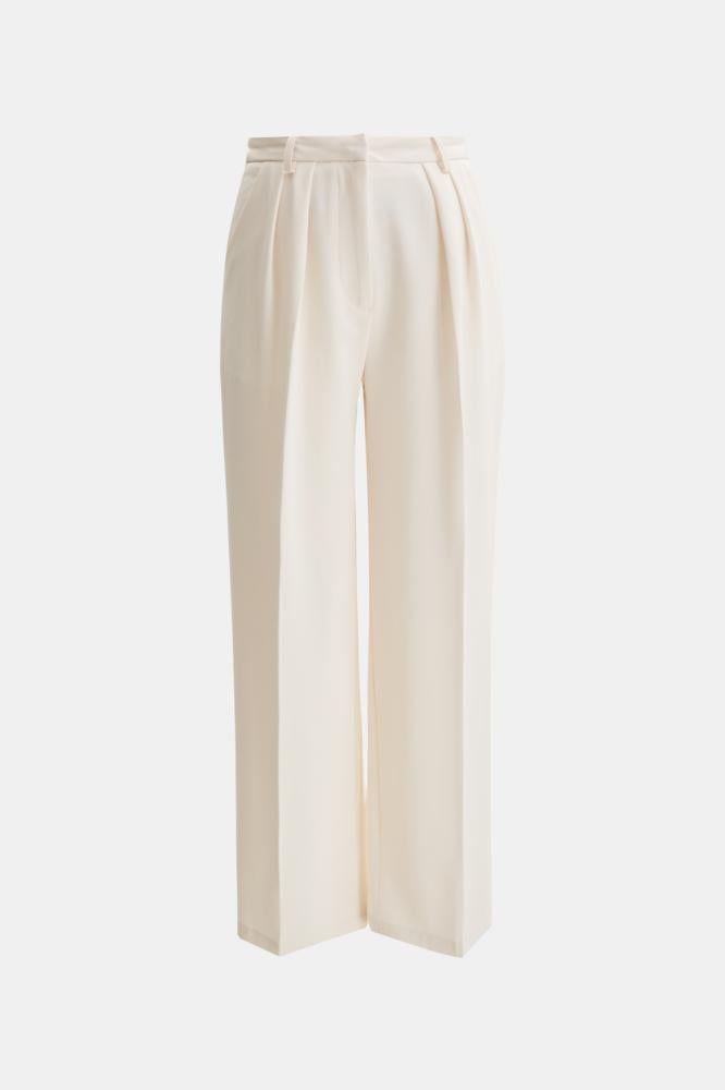 بنطلون بكسرات أنيقة، بتصميم بخصر مرتفع و بقصة أرجل واسعة، بسحاب إغلاق أمامي ، لأسلوب كلاسيكي مريح نسقية مع جاكيت مماثل