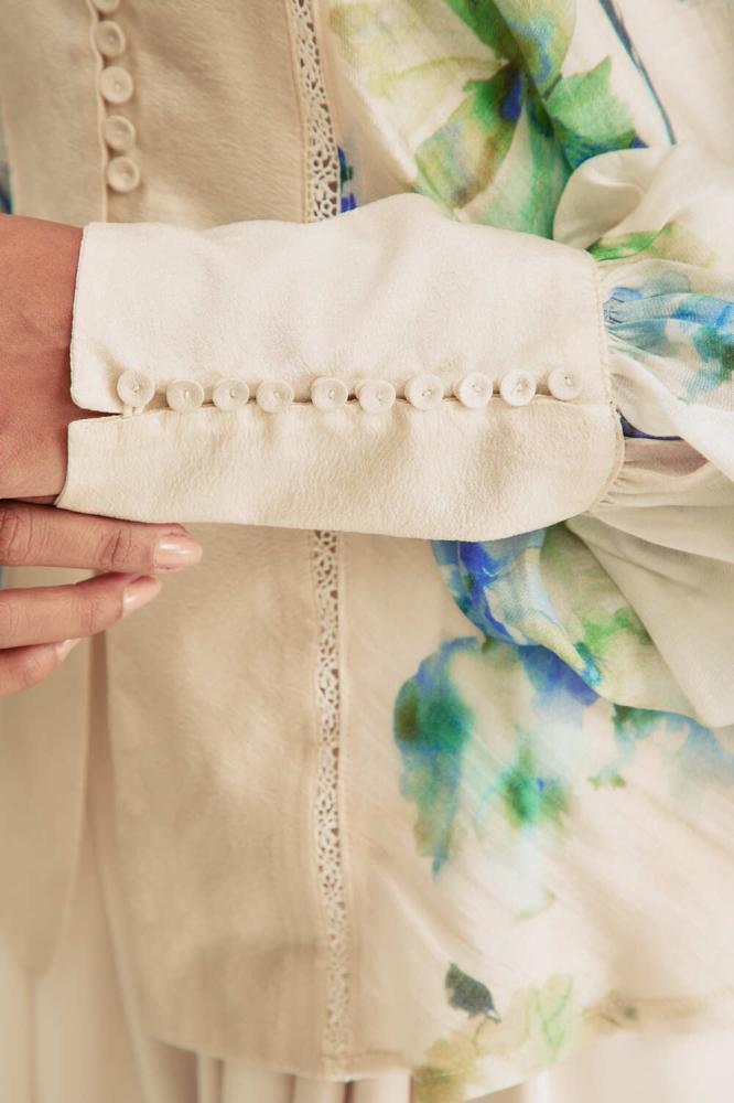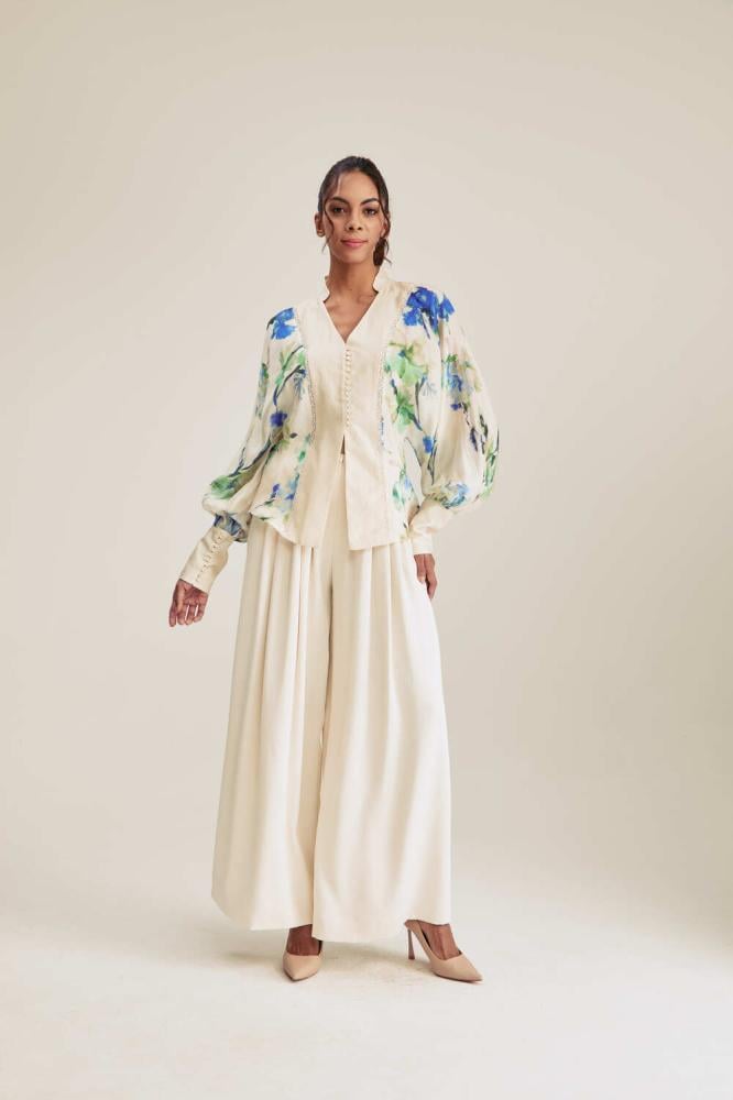 بلوزة أنيقة بتصميم مميز مزينة بنقوش موردة جذابة تضفي لمسة أنثوية راقية. تتميز بأزرار إغلاق في الأمام تمنحها طابعًا كلاسيكيًا وأكمام واسعة لإطلالة مريحة وعصرية. مثالية للتنسيق مع تنورة أو بنطلون لإطلالة متكاملة تناسب مختلف المناسبات