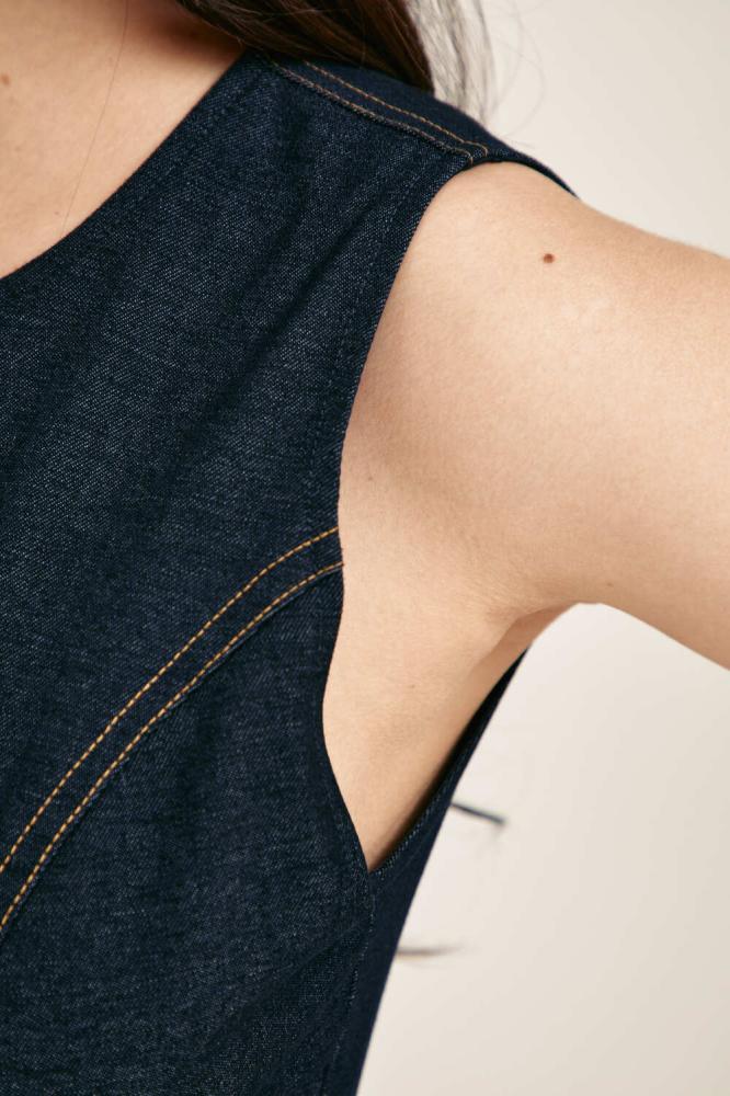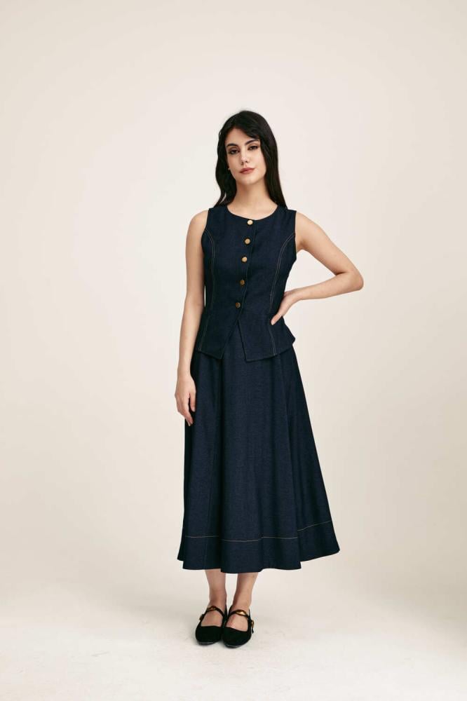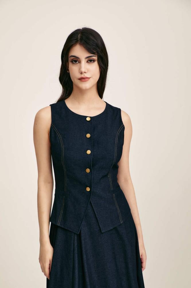 جاكيت جينز بلا أكمام بأزرار كبس معدنية عملية تضيف لمسة عصرية. الجيوب الأمامية تمنحك مظهرًا عمليًا وجذابًا. نسّقيه مع تنورة مماثلة لإطلالة متناسقة وأنيقة