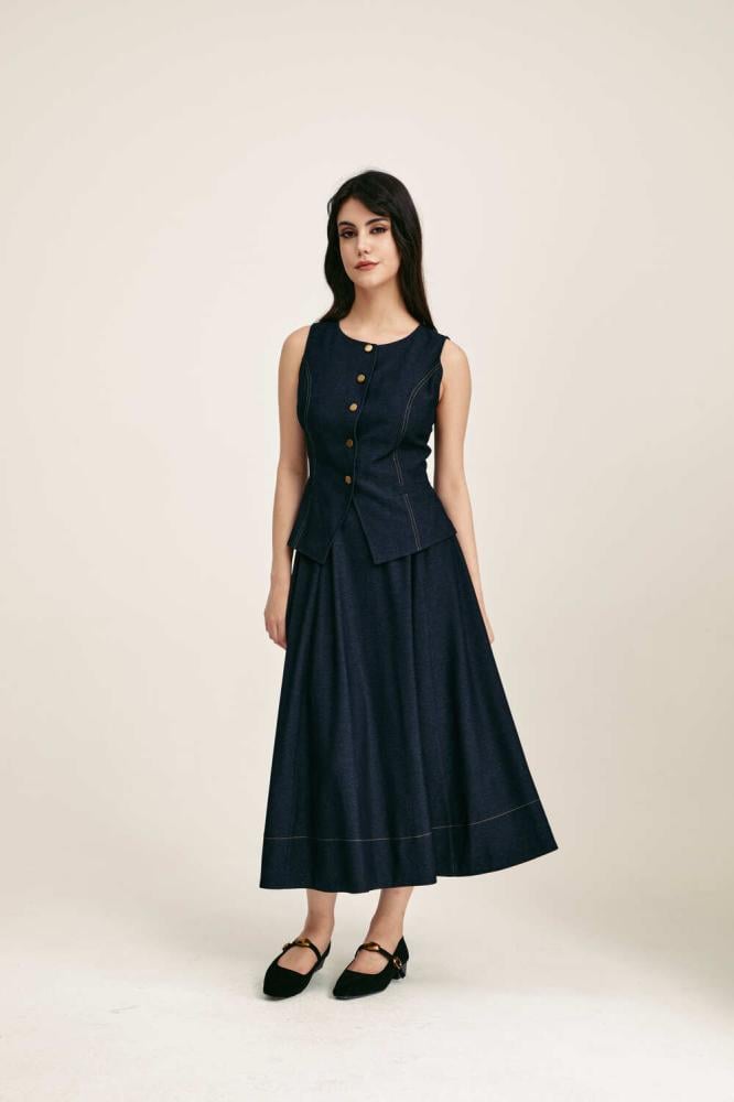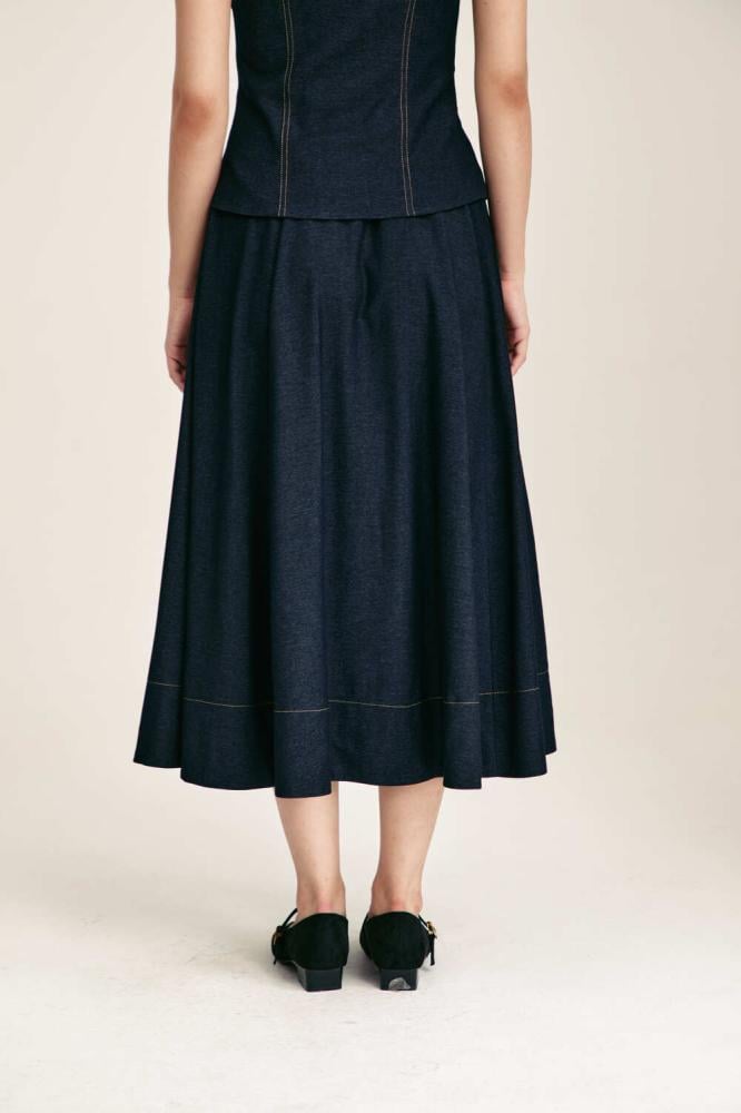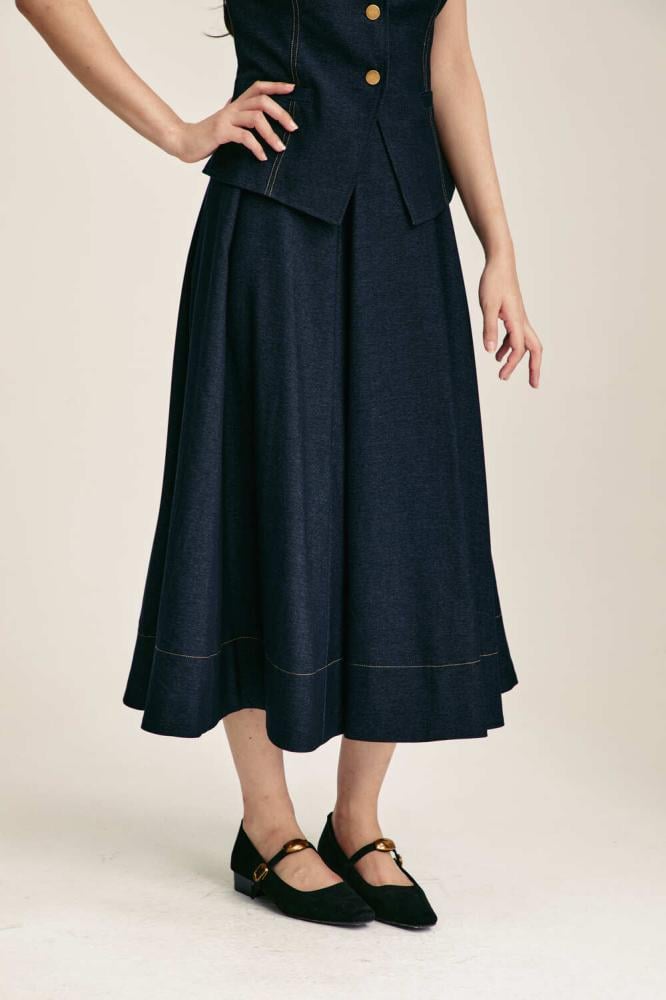 تنورة دينم بتصميم عملي وعصري، بسحاب مخفي للإإغلاق ، تأتي بقصّة واسعة تمنح حرية في الحركة وطابعاً أنيقاً. مثالية لإطلالة كاجوال متجددة