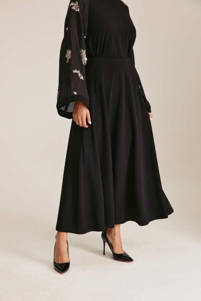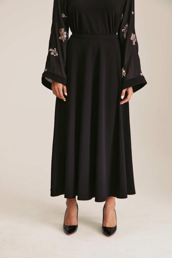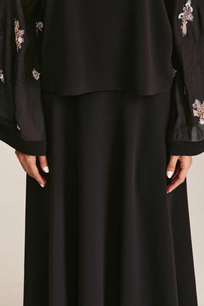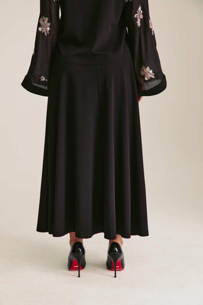 تنورة بطول متوسط وبقصة جذابة تنساب على الجسم بشكل أنيق، مطرزة بالكامل بترتر شفاف يضفي لمسة براقة وساحرة. وتزينها طبعة جلد الأفعى