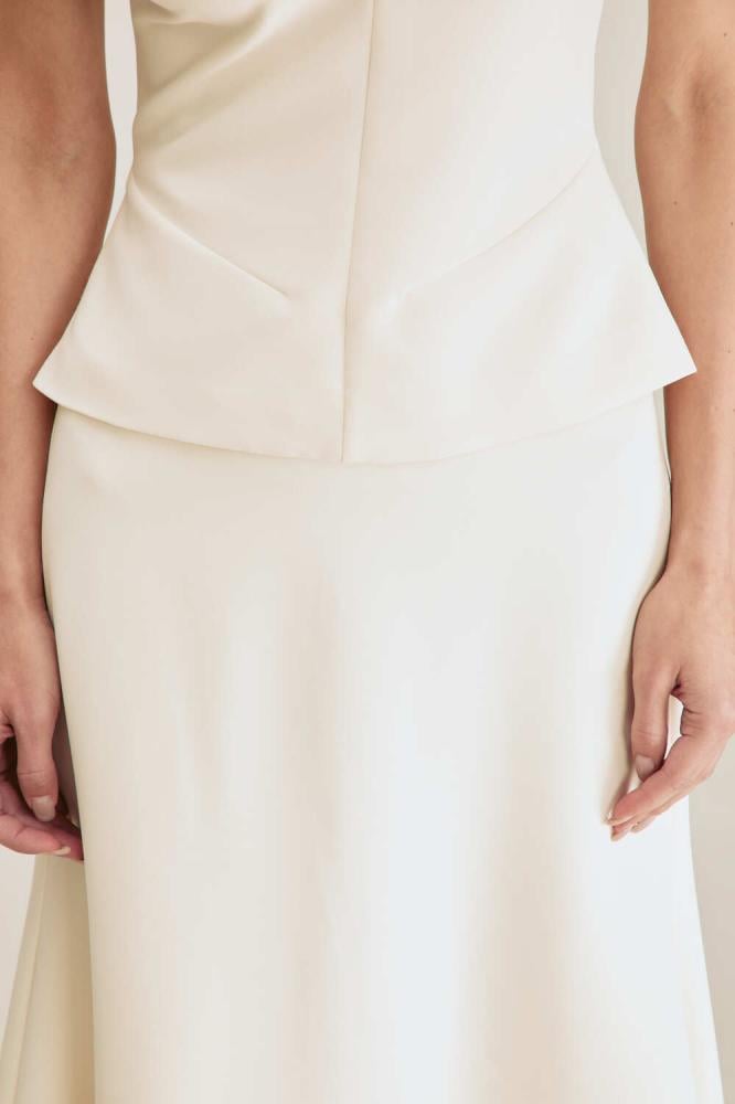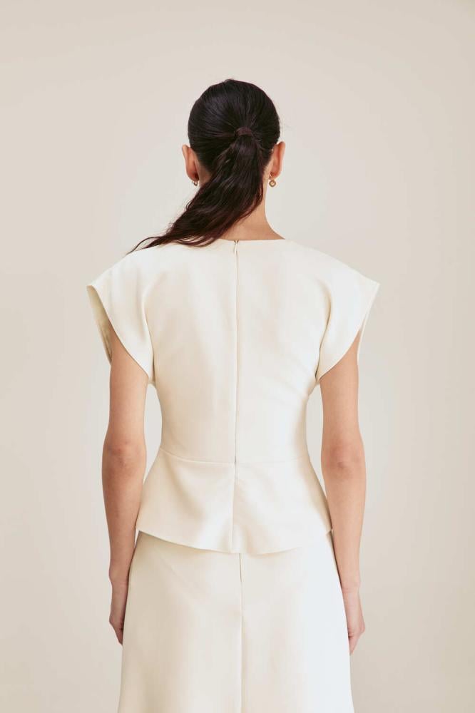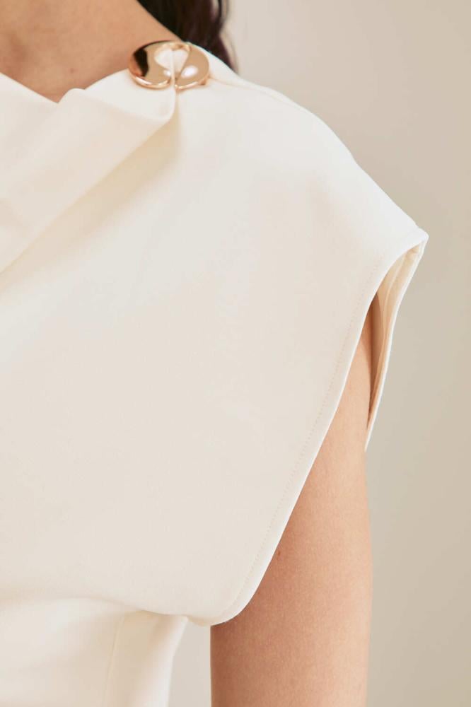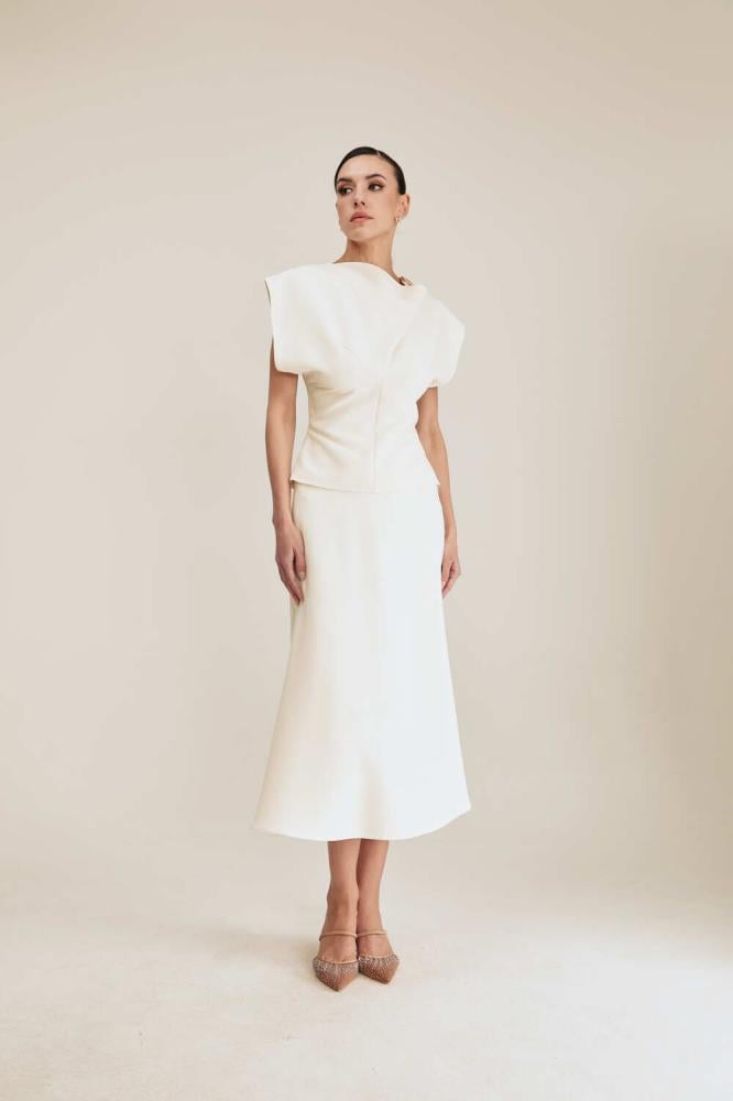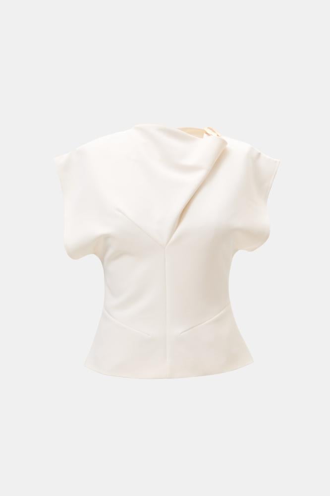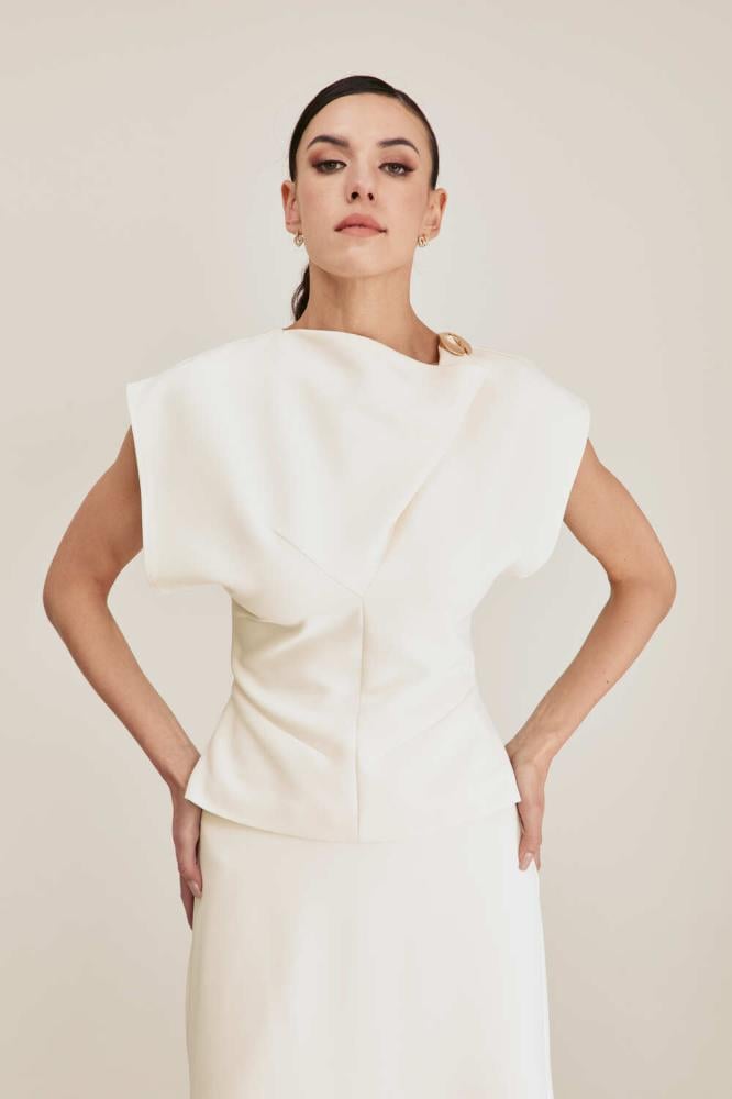 بلوزة أنيقة بلون أبيض عاجي بتصميم هندسي مميز، تتميز بأكتاف عريضة وقصة غير متماثلة مع طيات بارزة. مزودة بتفصيل معدني عند الكتف لإضفاء لمسة فاخرة. القَصّة الضيقة عند الخصر تعزز من شكل الجسم بأسلوب أنثوي راقٍ.