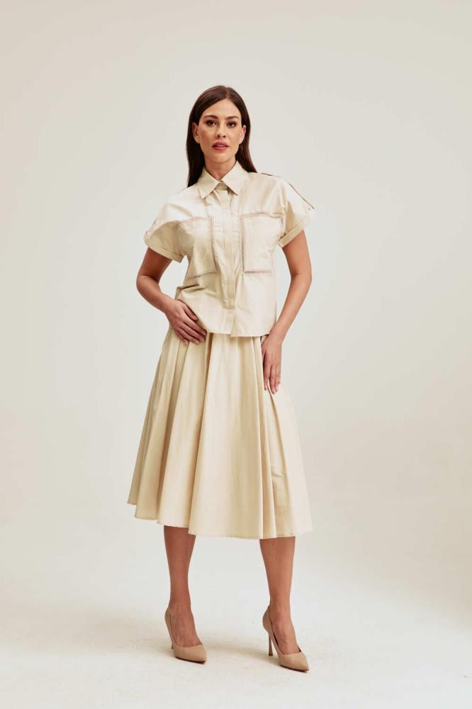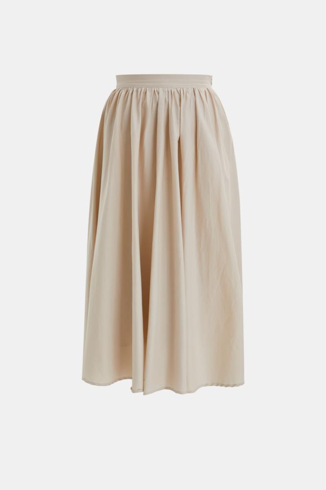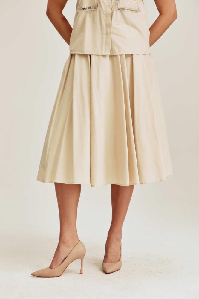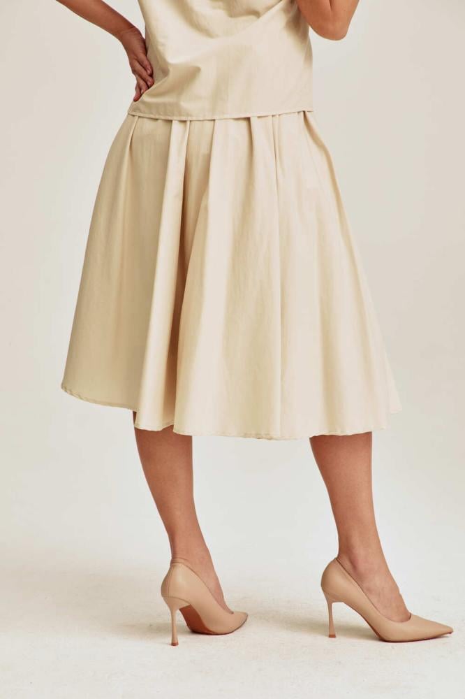 تنورة ميدي بقصّة واسعة ، مزينة بطيات بسيطة، مصممة بخصر مطاطي لراحة مثالية وإطلالة أنثوية ناعمة. نسّقيها مع القميص المطابق للحصول على مظهر عصري متكامل