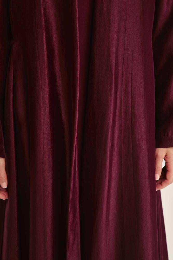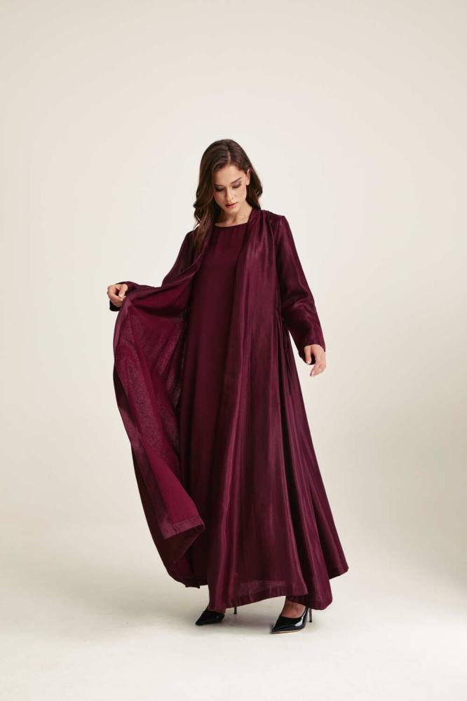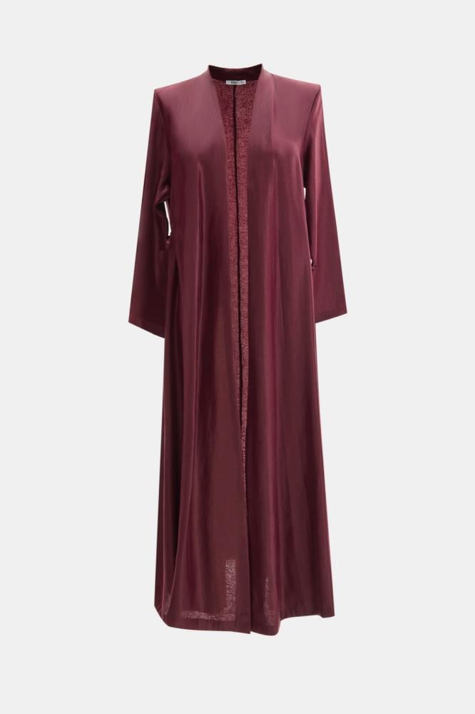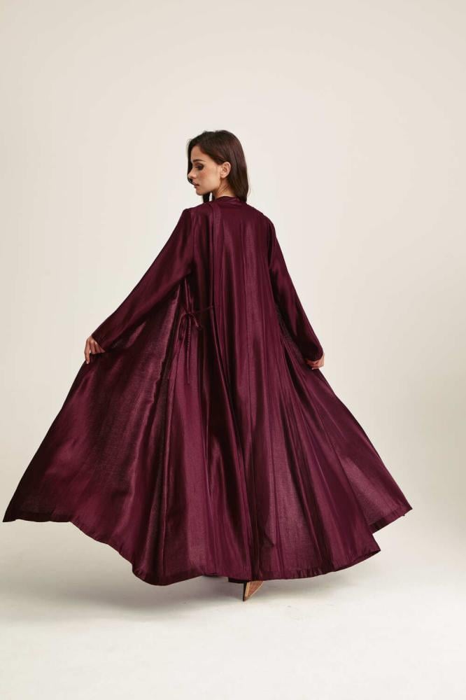 عباية مفتوحة من الأمام بأربطة أنيقة ولمسات لامعة تضيف فخامة، مثالية لتنسيقها مع فستان داخلي لإطلالة راقية تجمع بين الأناقة والتميز.