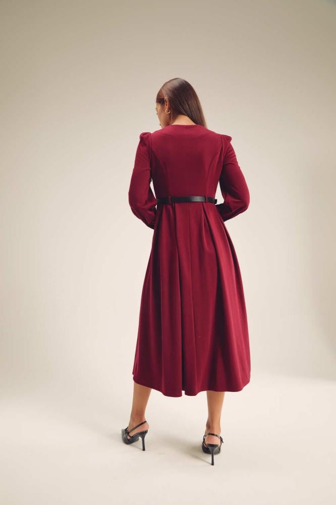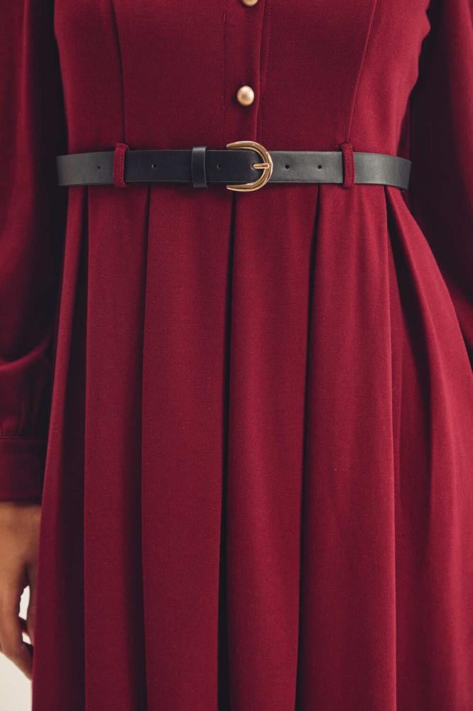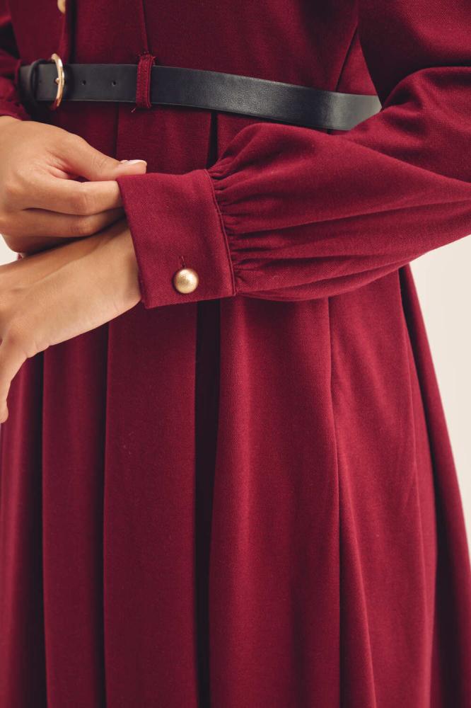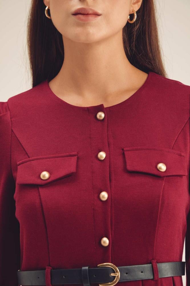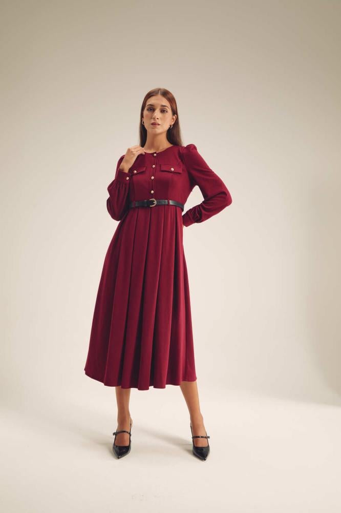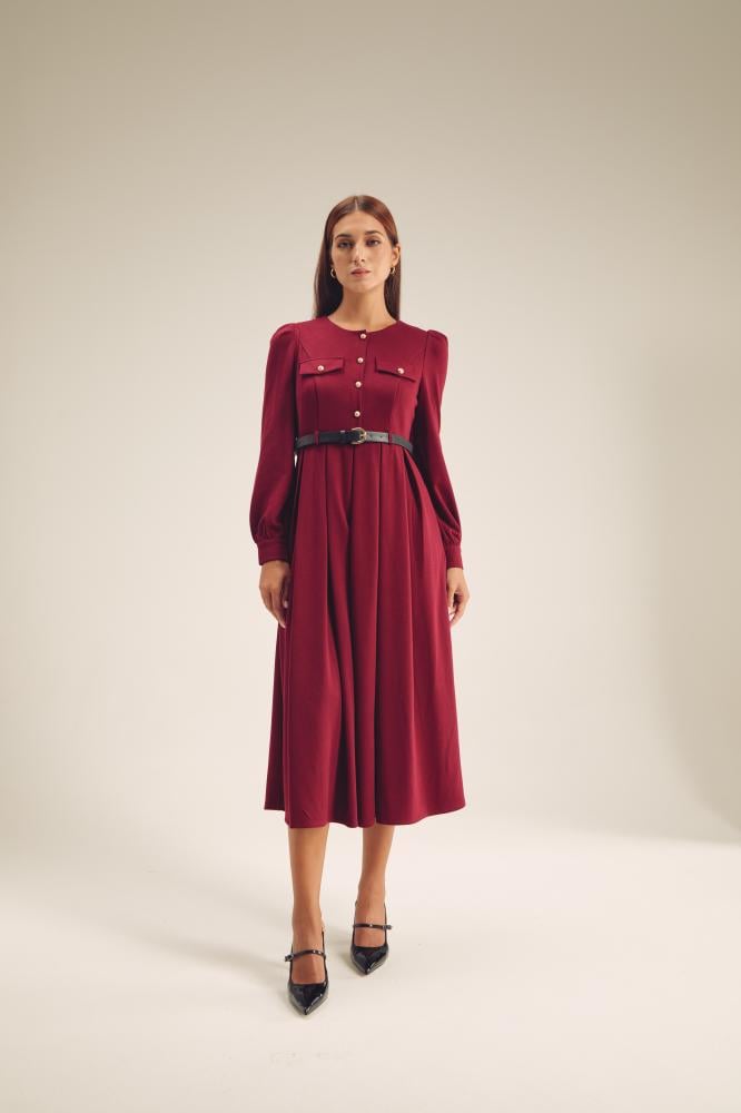 فستان كلاسيكي مفعم بالأنوثة،بتصميم مزين بجيوب وأزرار ذهبية ،ويتميز بأكتاف منفوخة وبقصة ناعمة بتنورة كسرات ، كما ويأتي مع حزام جلد بإبزيم معدني ، نسقية مع إكسسورات لتكملي أناقة مظهرك