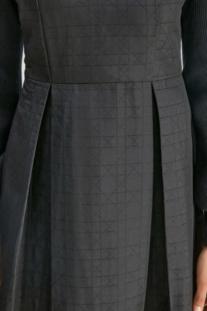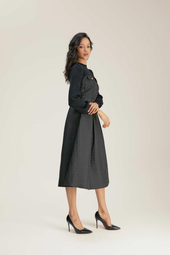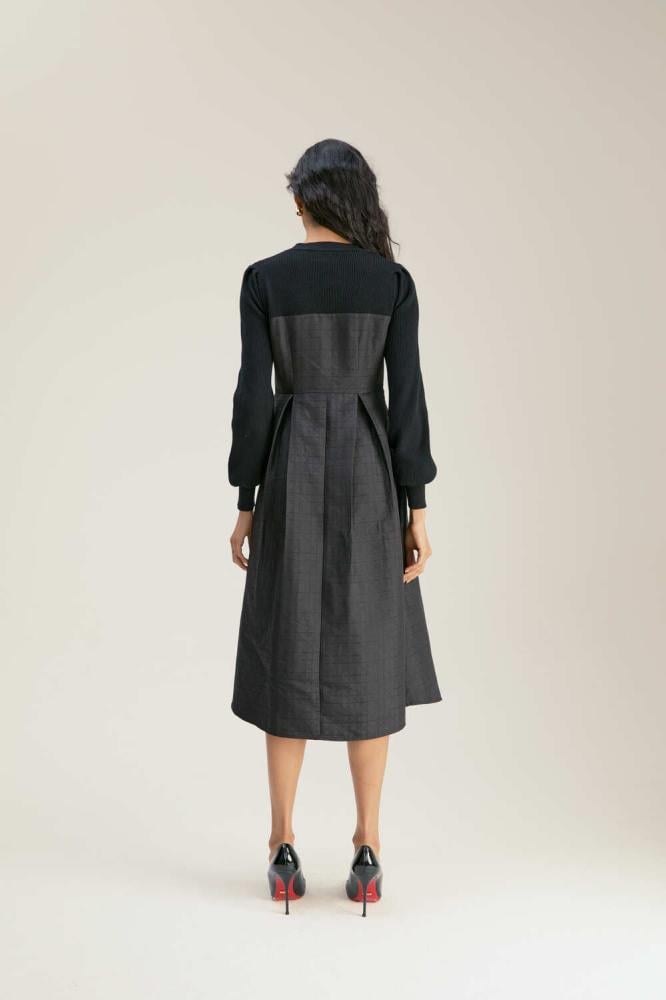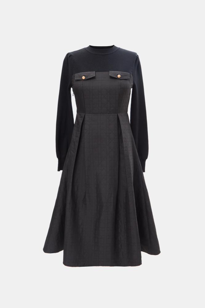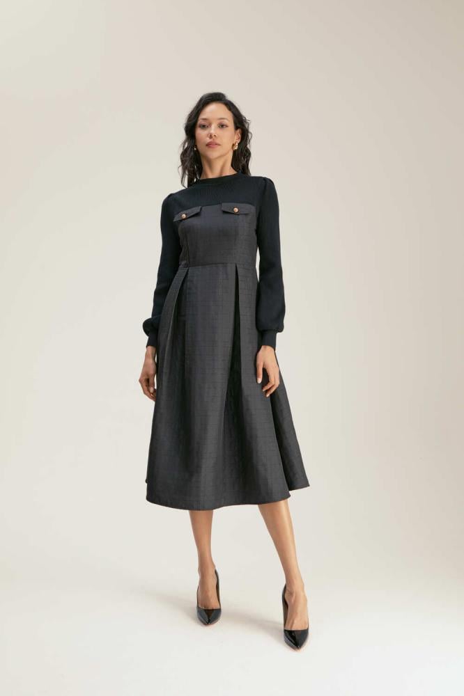 فستان راقي ،يجمع بين الخامة المحبوكة من الأعلى التي تضفي لمسة من الرقي والدفء، وخامة الجاكار الفاخرة من الأسفل التي تبرز الفخامة والتفاصيل الدقيقة. مزين بجيوب أنيقة، ويأتي بقصة A-Line جذابه تعزز من جمال قوامك.
