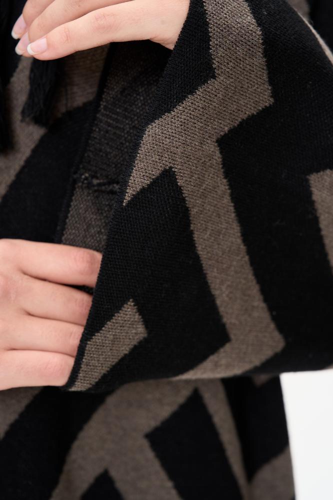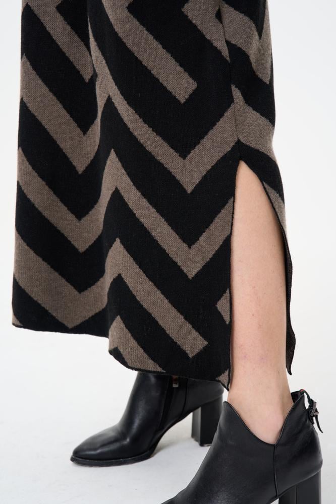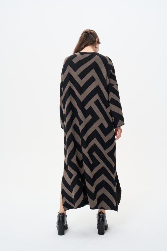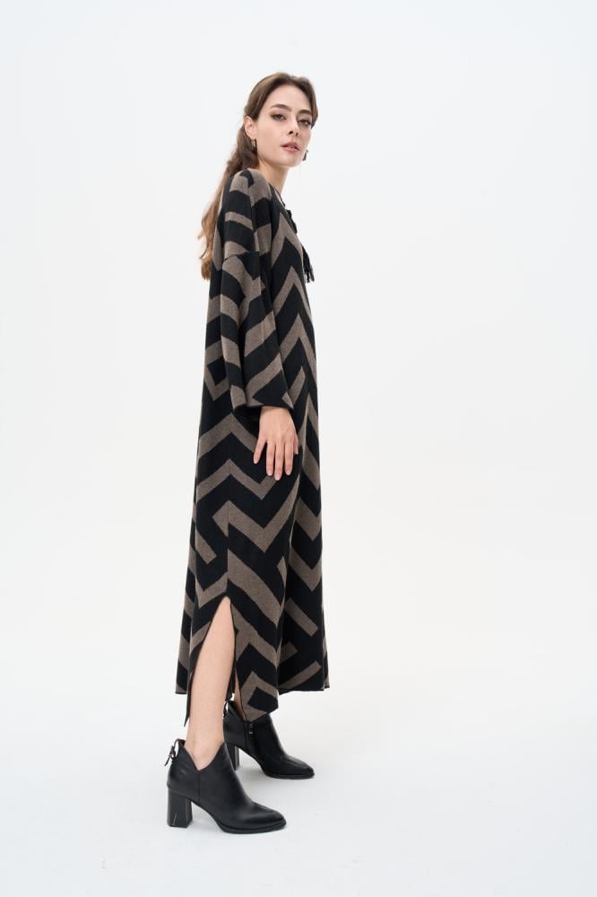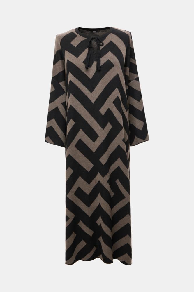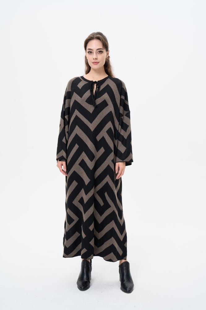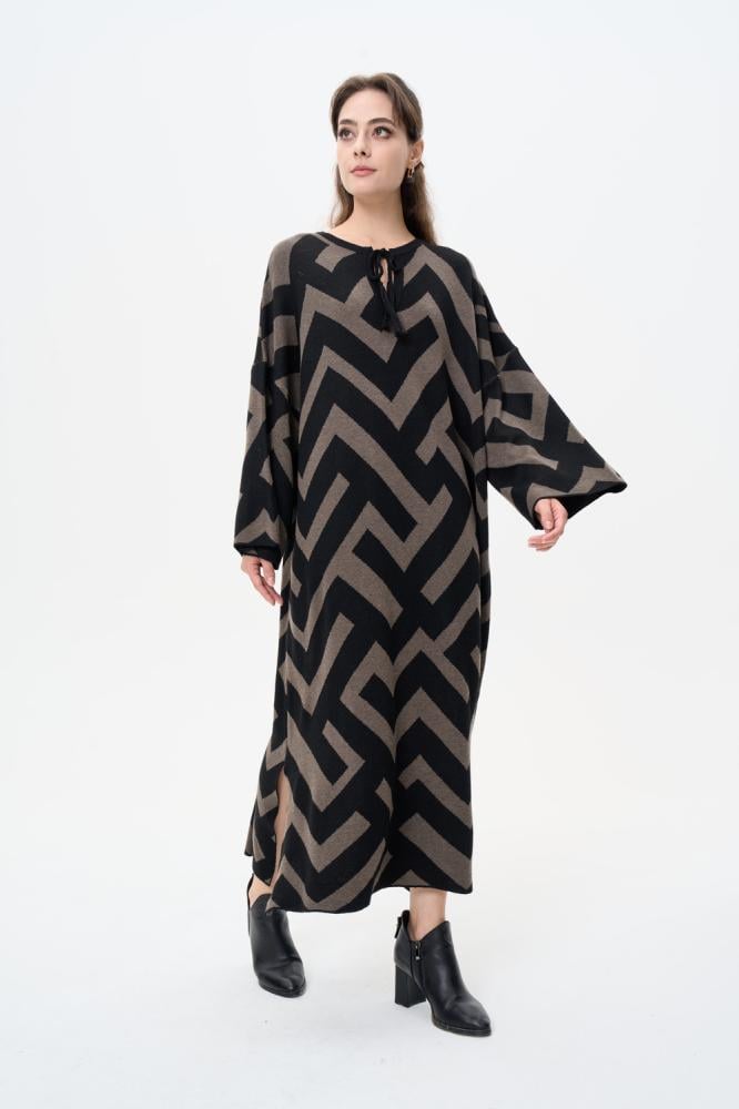 فستان شتوي بقصة اوفر سايز بتصميم بياقة مستديرة بربطة ومصمم بأكمام منسدلة ، مزدان بنقوش هندسية وبفتحات من أسفل