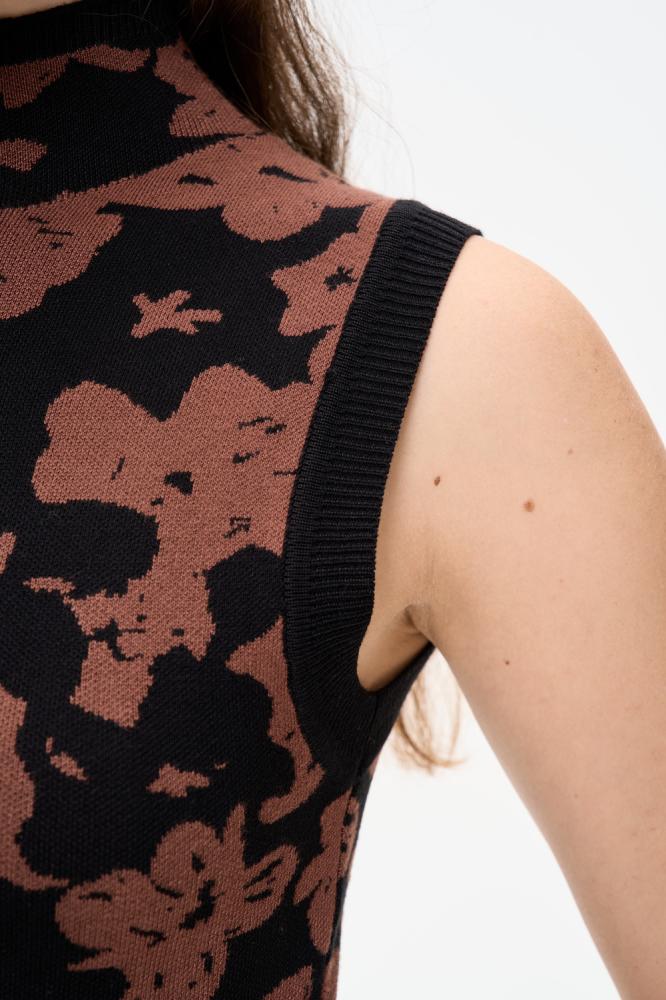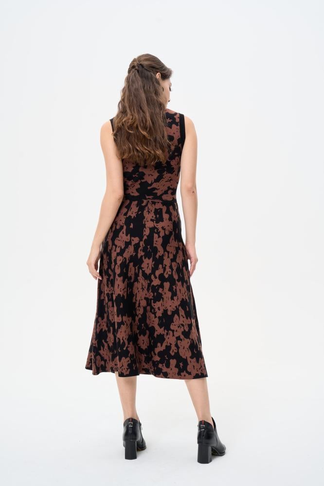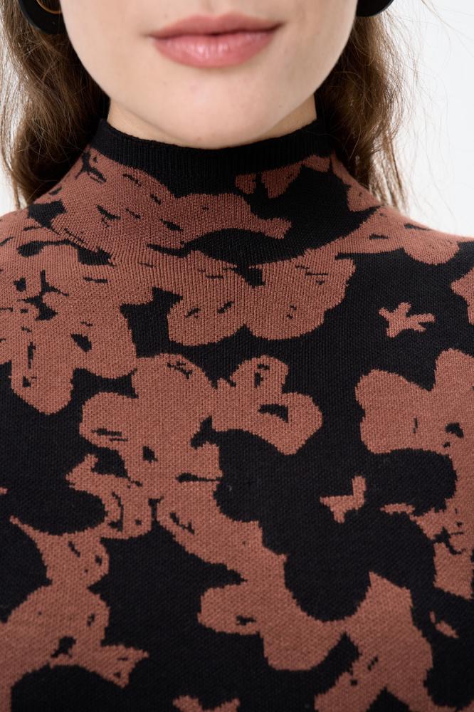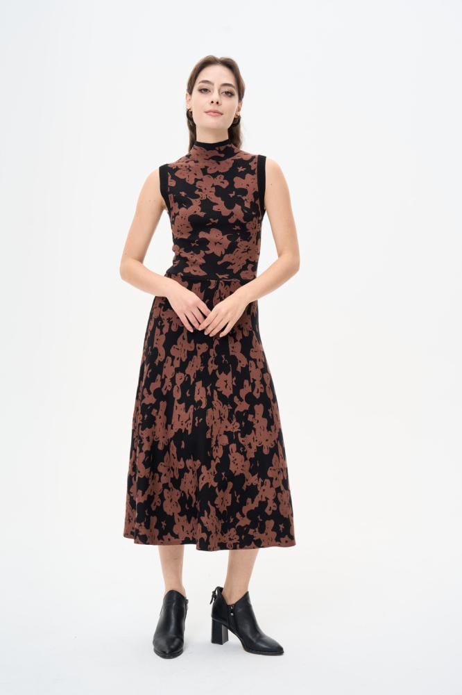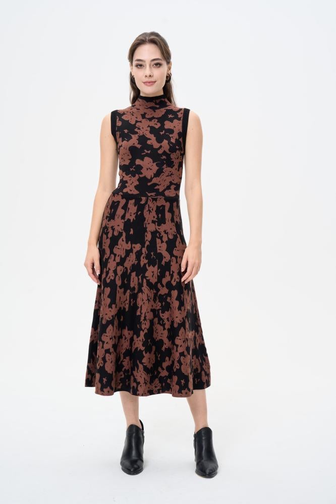 لإطلالة شتوية عصرية فستان محبوك مزين بنقوش موردة ، بتصميم بياقة عالية وبلا أكمام ،ويتميز بقصة A-Line اعتمدية لمظهرأكثر أناقة