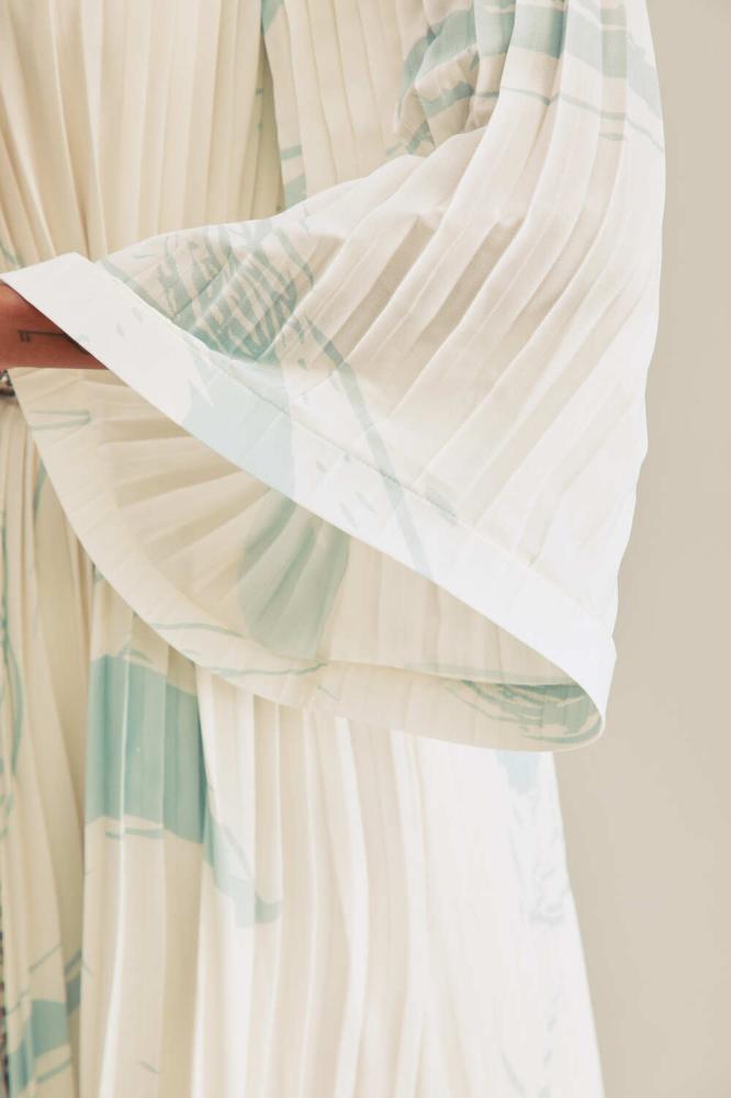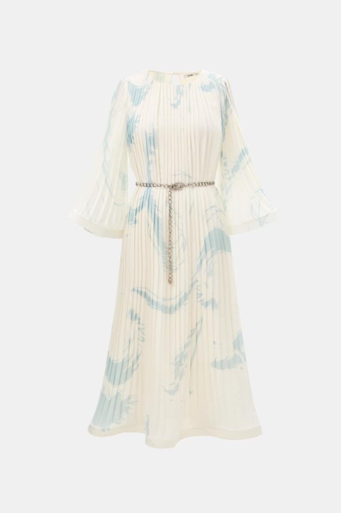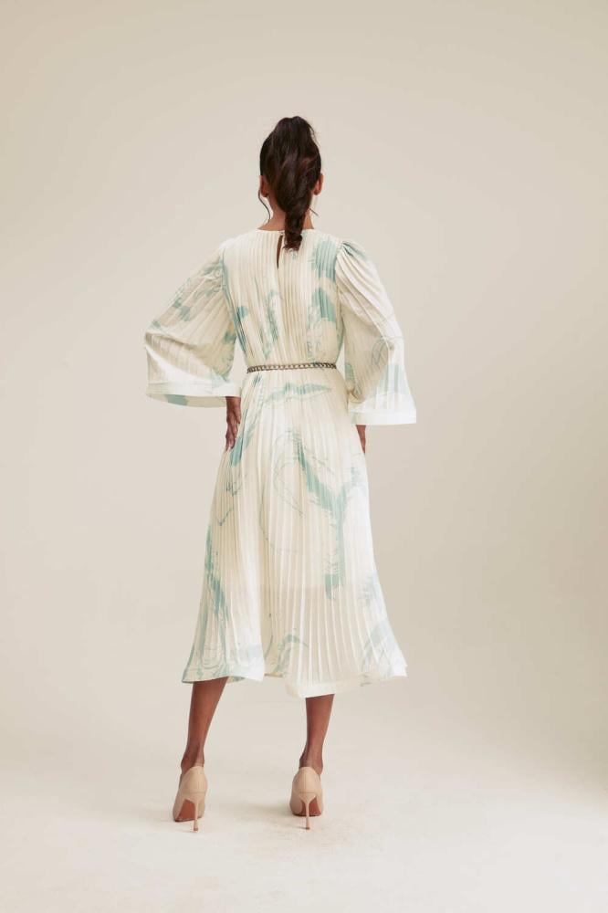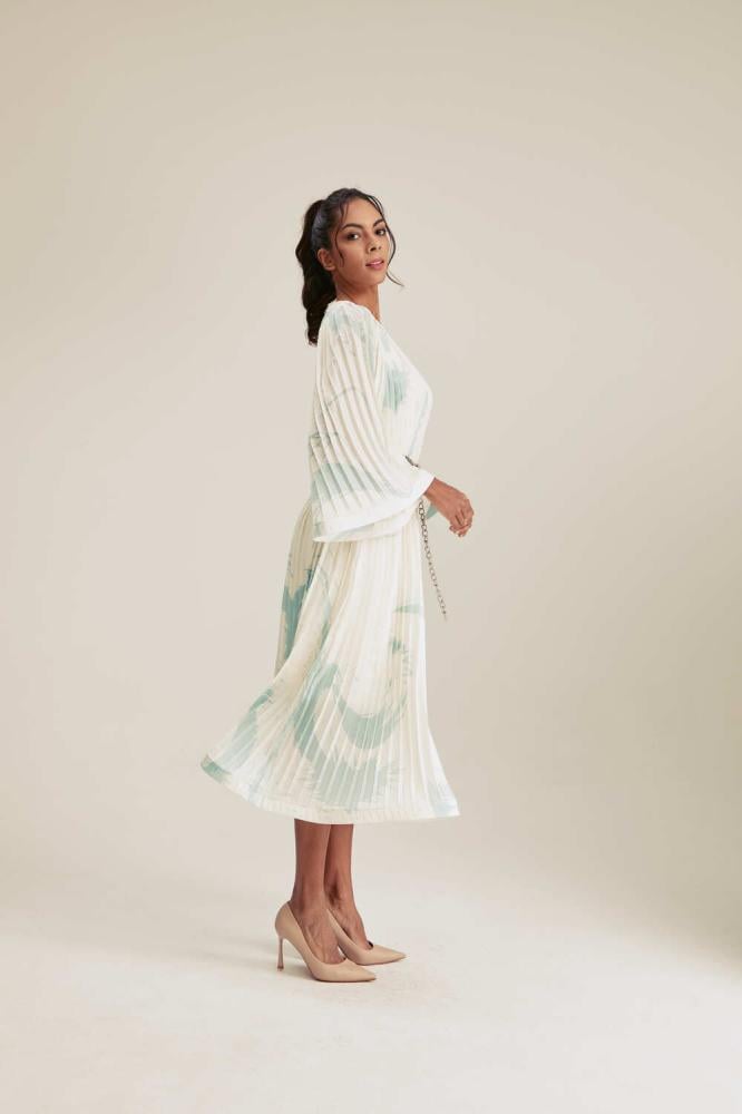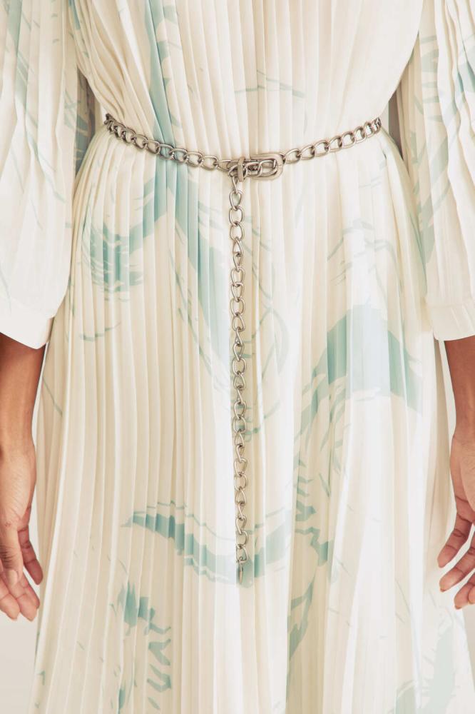 إضافة أنيقة تنبض بالفخامة لخزانتك، فستان مطبع ومزين بطيّات يتميز بقصة انسيابية كما ويأتي مع حزام سلسلة معدنية تجعله مثاليًا للارتداء في مختلف المناسبات. ويمكن تنسيقه مع مجوهرات رقيقة لإطلالة عصرية ،