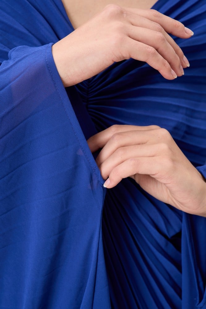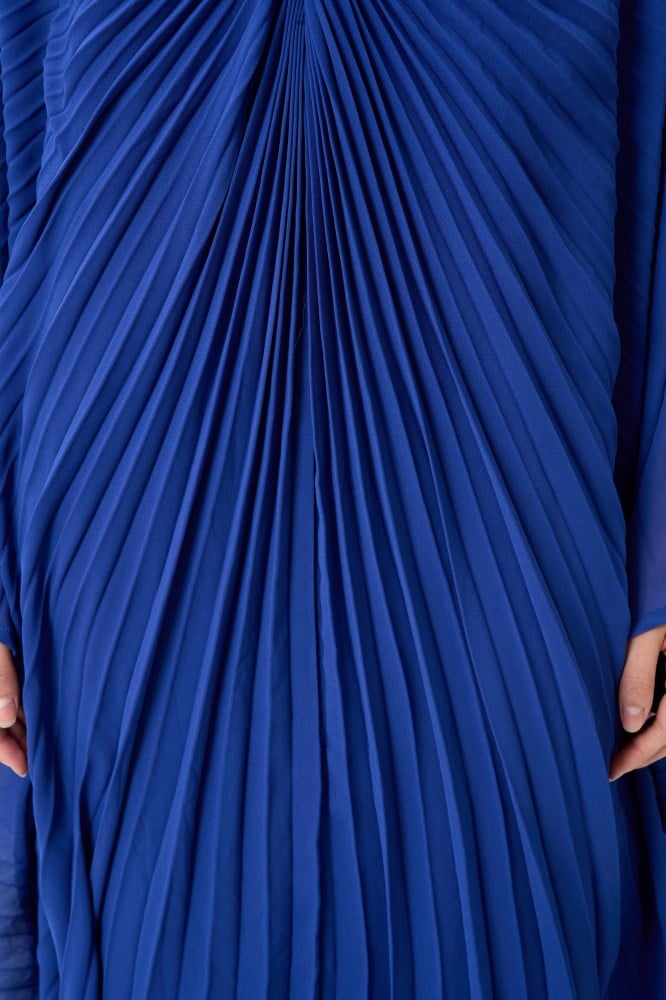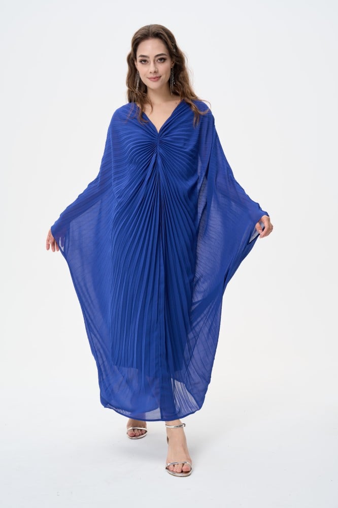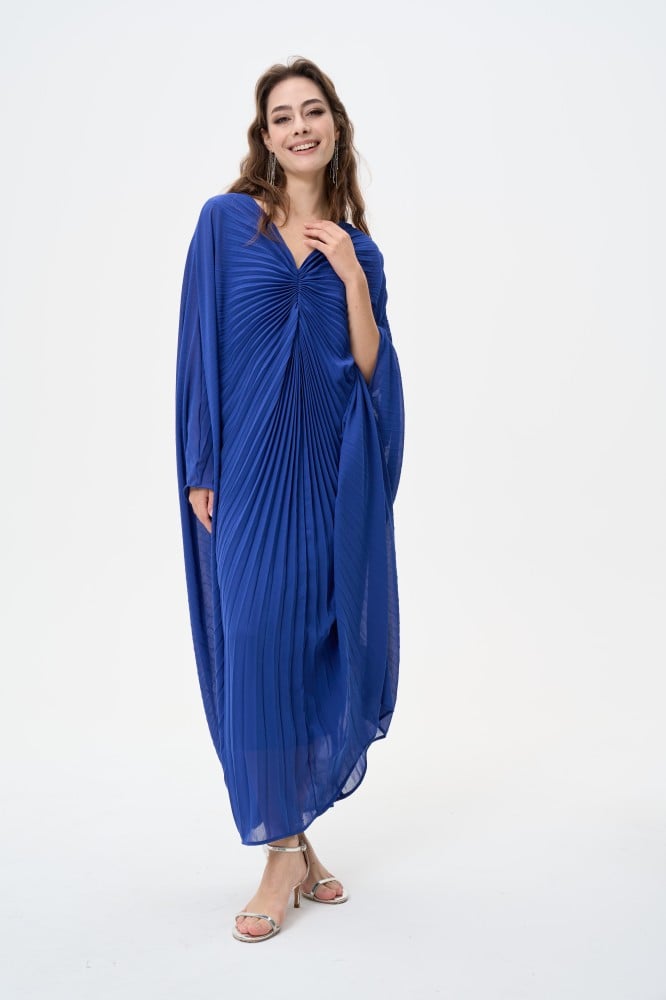 تألقي بإطلالة فريدة ومحتشمة مع هذا الفستان بلون مبهر جذاب ويتميز بفتحة رقبة على شكل حرف V وأكمام طويلة ،ارتديه مع أقراط جذابة.
