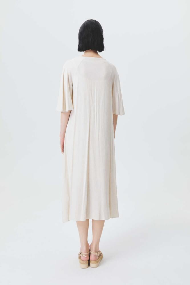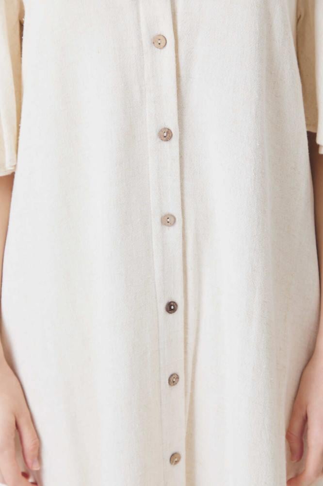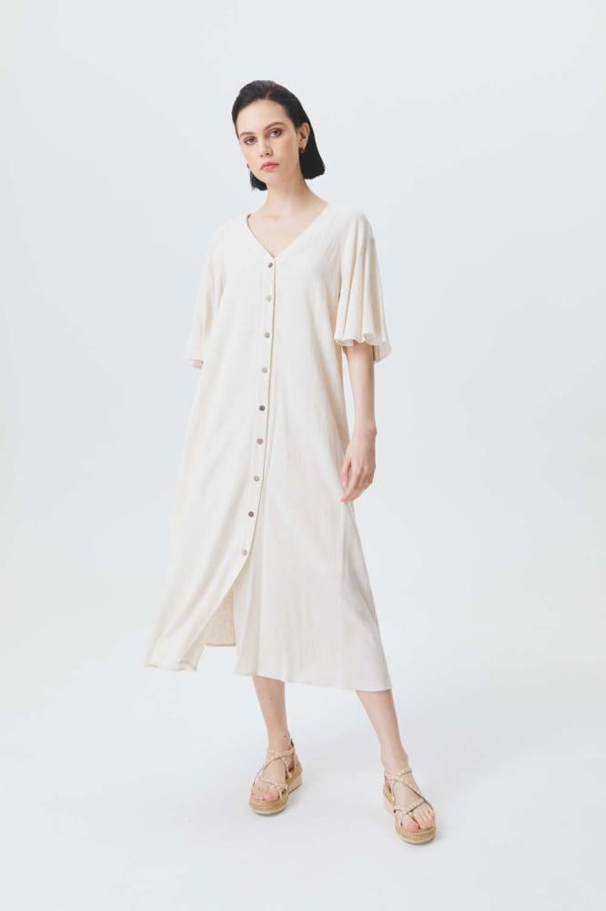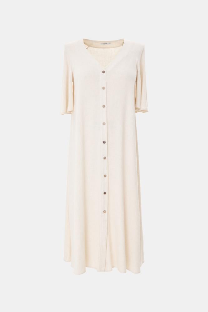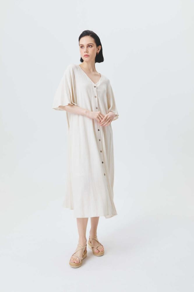 احصلي على إطلالة أنيقة بإقتناء فستان بياقة v وبأكمام قصيرة ويأتي بقصة انسيابيه مريحة وأزررار للإغلاق من الأمام