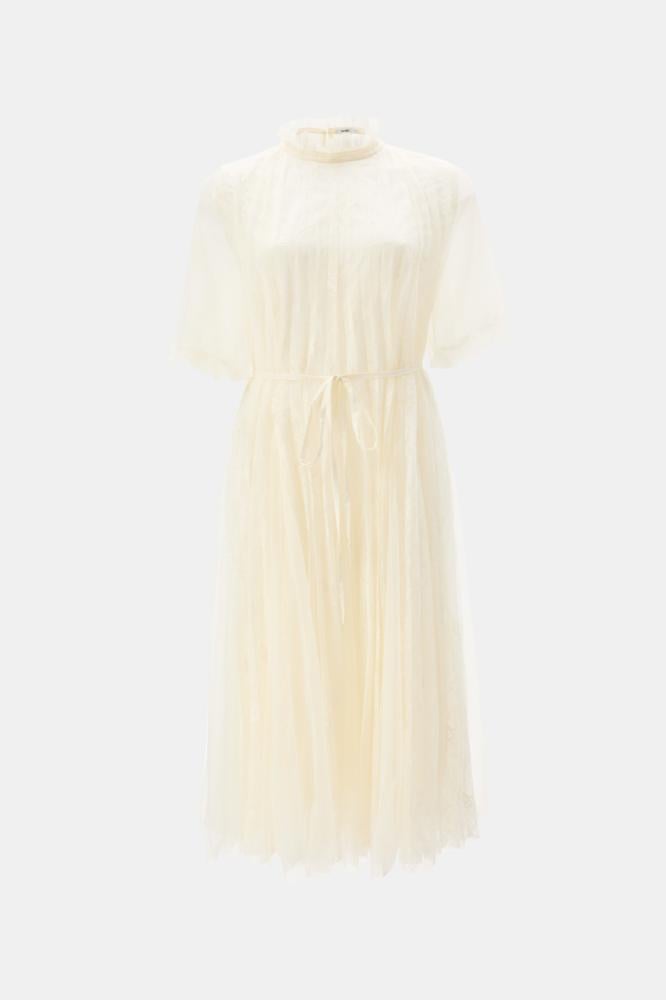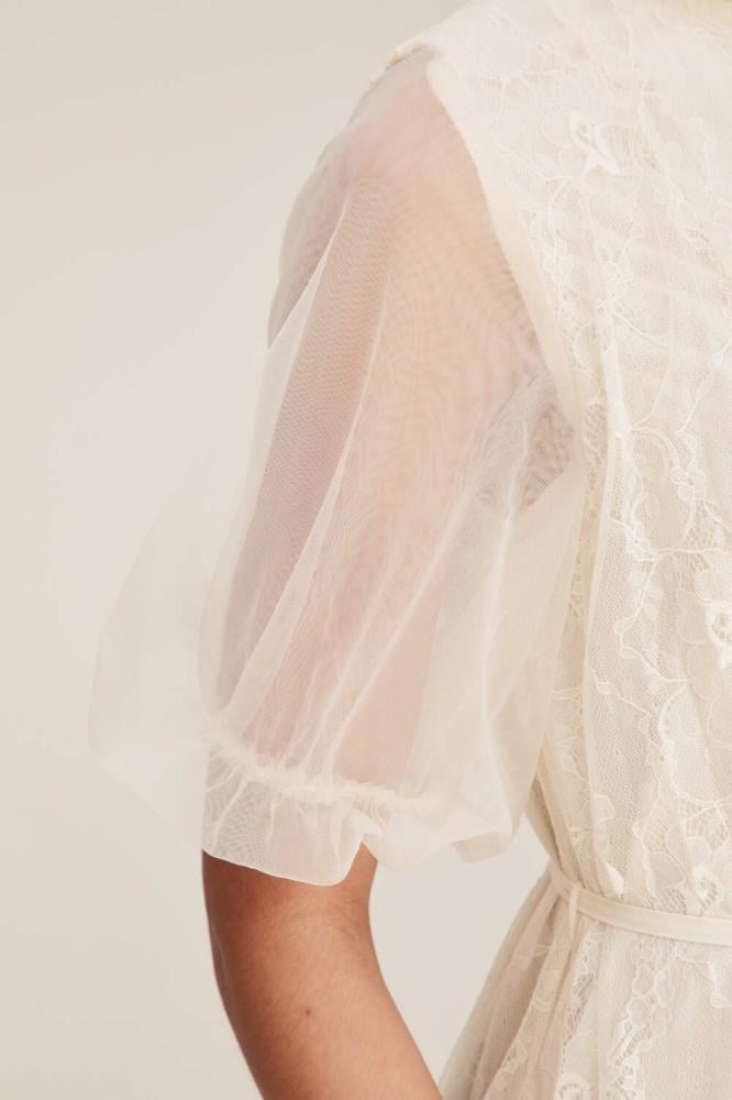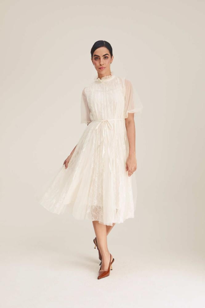 تميزي بإطلالة مفعمة بالثقة والرقي واقتني هذا الفستان بتصميم ينبض بالأناقة الكلاسيكية ،مصمم بياقة كشكش وبأكمام منفوخة كما ويأتي بقصة منسدلة بكسرات وحزام ربط