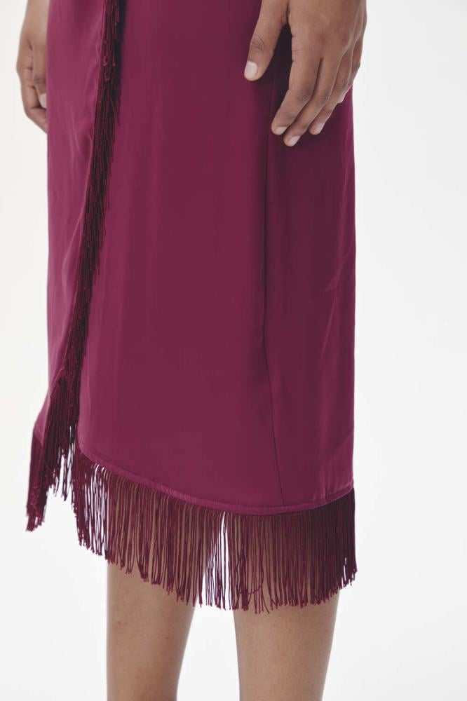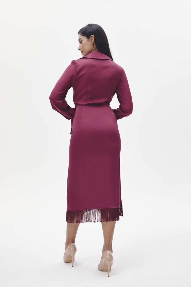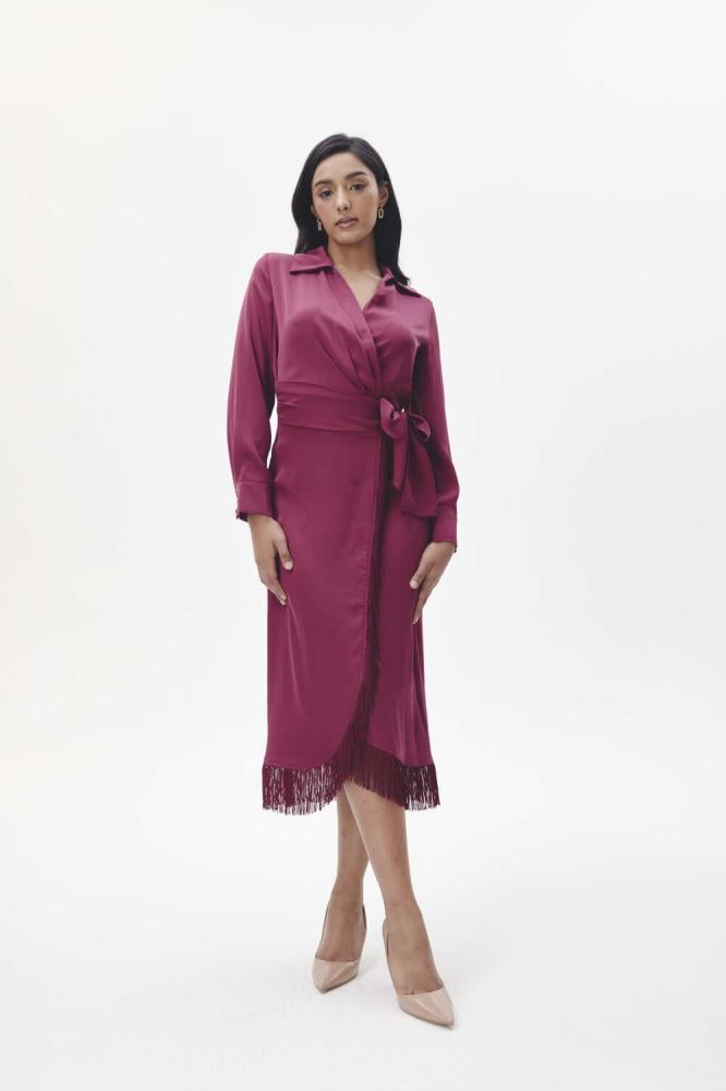 فستان كلاسيكي أنيق بتصميم ملفوف مفعم بالأنوثة.بملمس انسيابي ويتميز بحافة هدب برباط جانبي