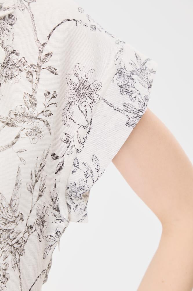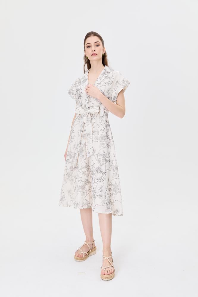 فستان ميدي مصمم بقصة كلاسيكية ، بأكمام قصيره وفتحة رقبة بطية ، كما يأتي بزر للإغلاق ومزين بحزام ، ويتزين بنقشة زهور تضفي على تصميمه لمسة عصرية