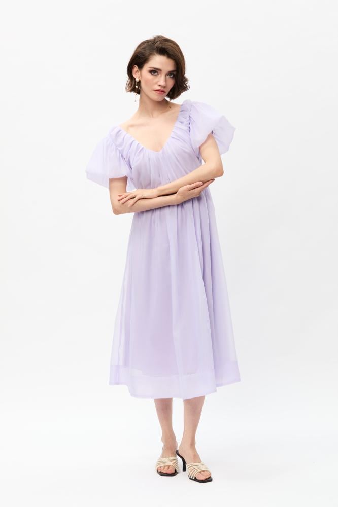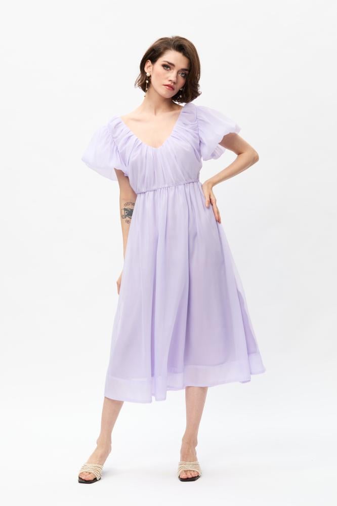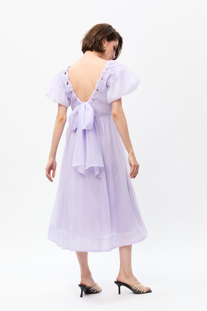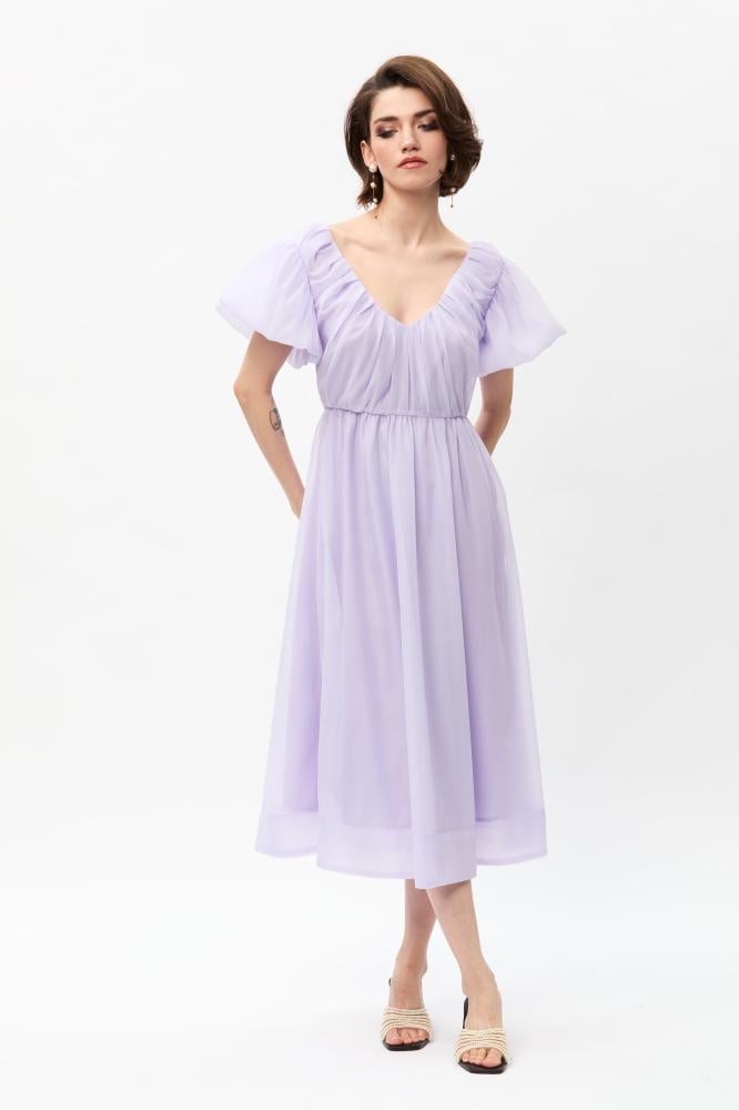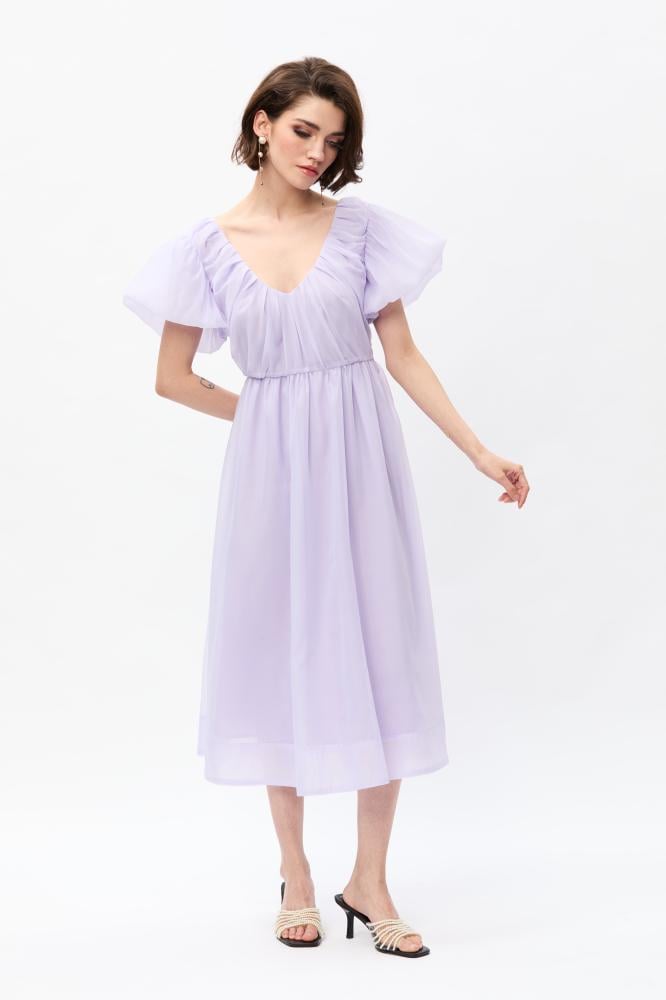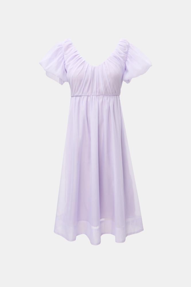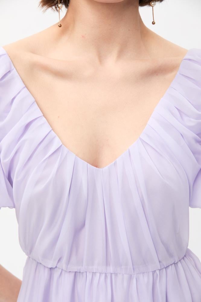 فستان بلون جذاب مفعم بالأنوثة والأناقة يتميز بأكمام منفوخة وبياقةV بثنيات بسيطة ، ومصمم بفتحة ظهر من الخلف مزينة بفيونكة ناعمة ،كما ويأتي بقصة على شكل حرف A