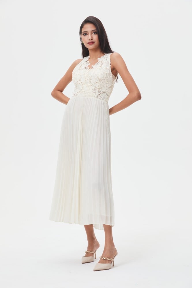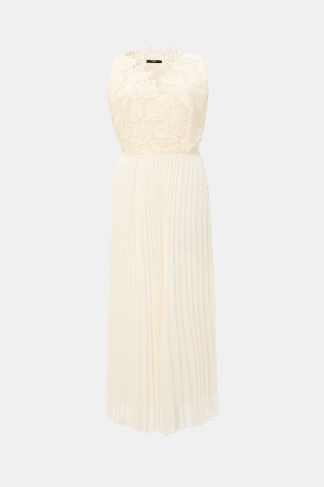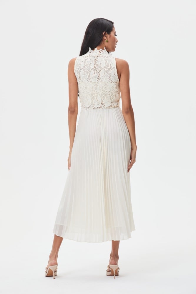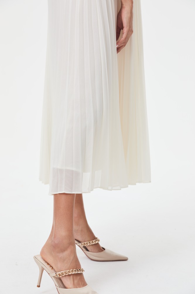ارتدي هذا الفستان الميدي المفعم بالأنوثة في مناسباتك البسيطة مصمم بياقة لف وبدون أكمام ويأتي بكسرات وسحاب مخفي للإغلاق