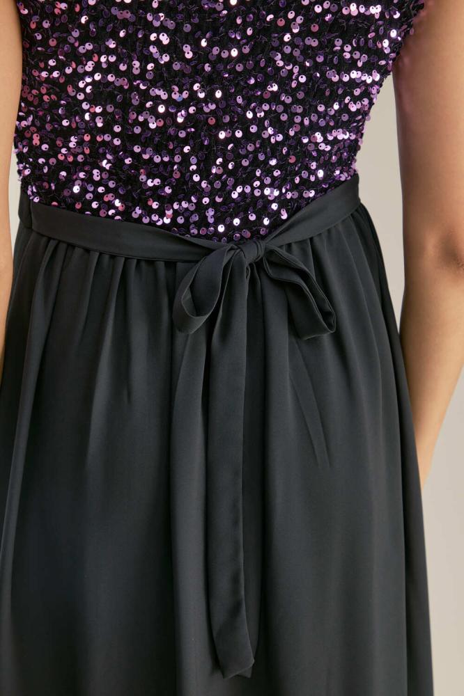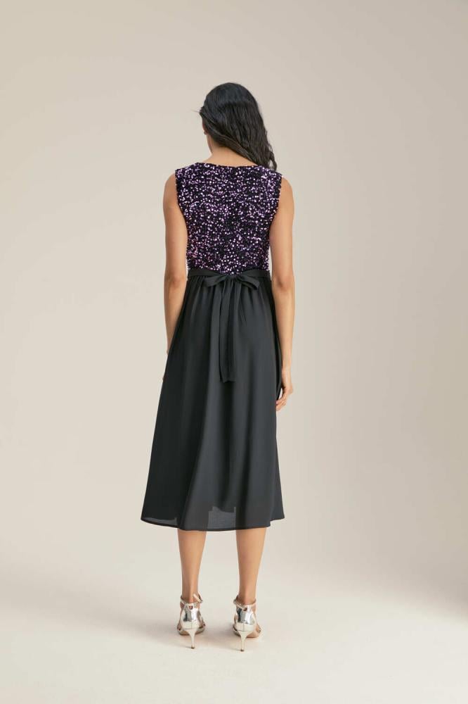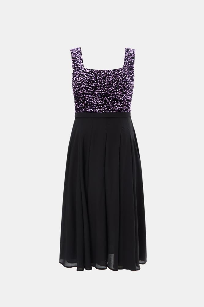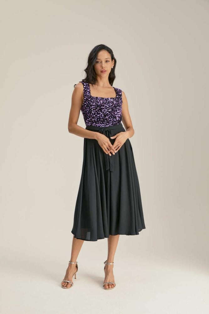 تألقي بإطلالة براقة في مناسباتك الراقية ،بفستان بقصة جذابة بتصميم بياقة مربعة وبدون أكمام ،ومزدان برباط من الأمام .