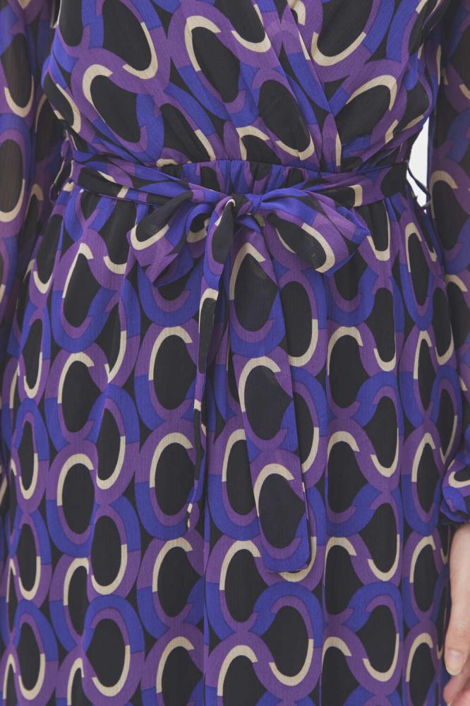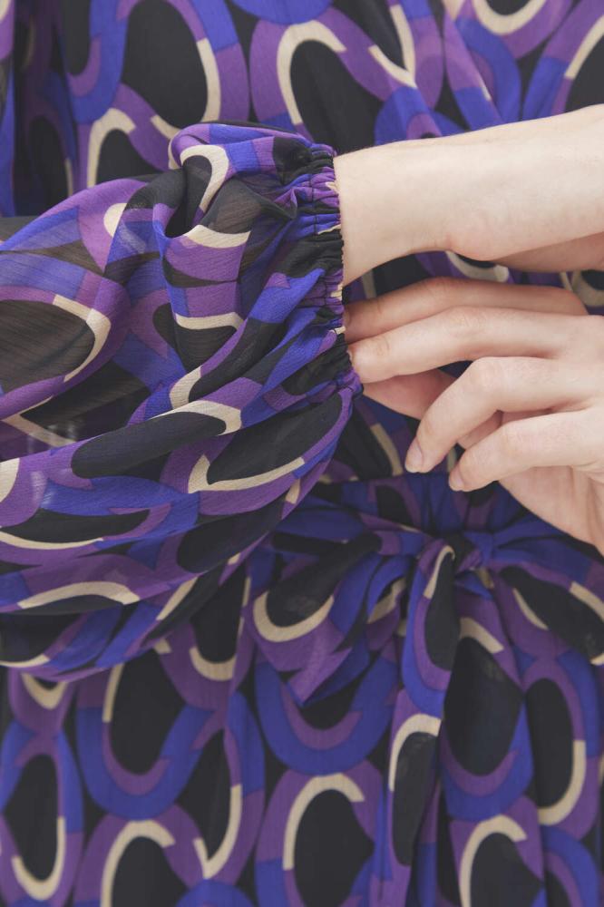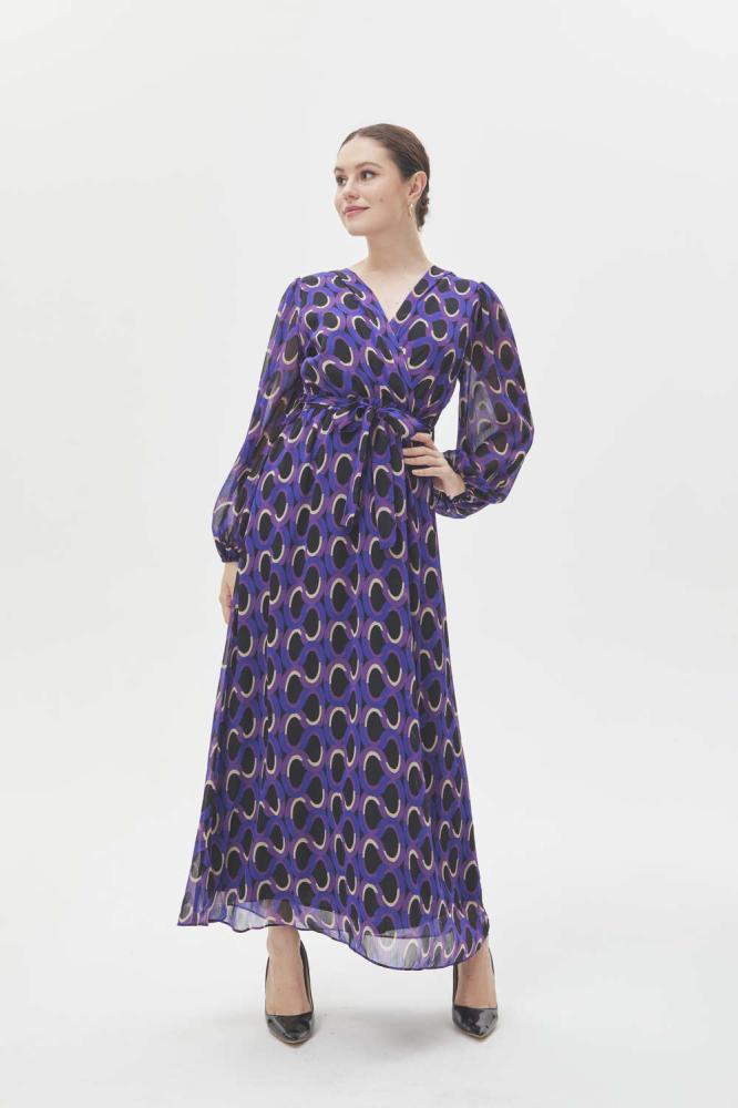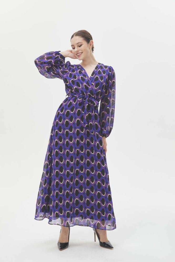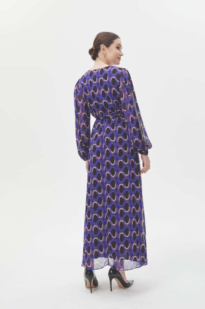فستان بتصميم يجمع بين الأناقة والبساطة بقصة كلاسيكية على شكل حرف A، يتميز بنقوش هندسية بألوان جذابة ، بياقة لف وبأكمام بالون ويأتي بخصر مطاطي ورباط خصر .