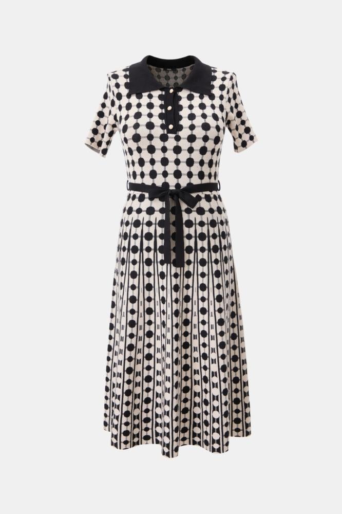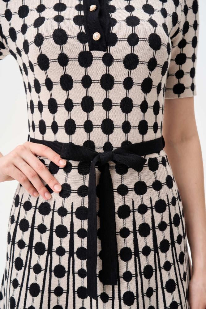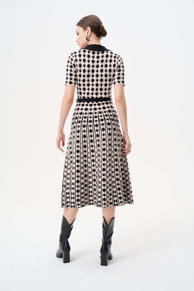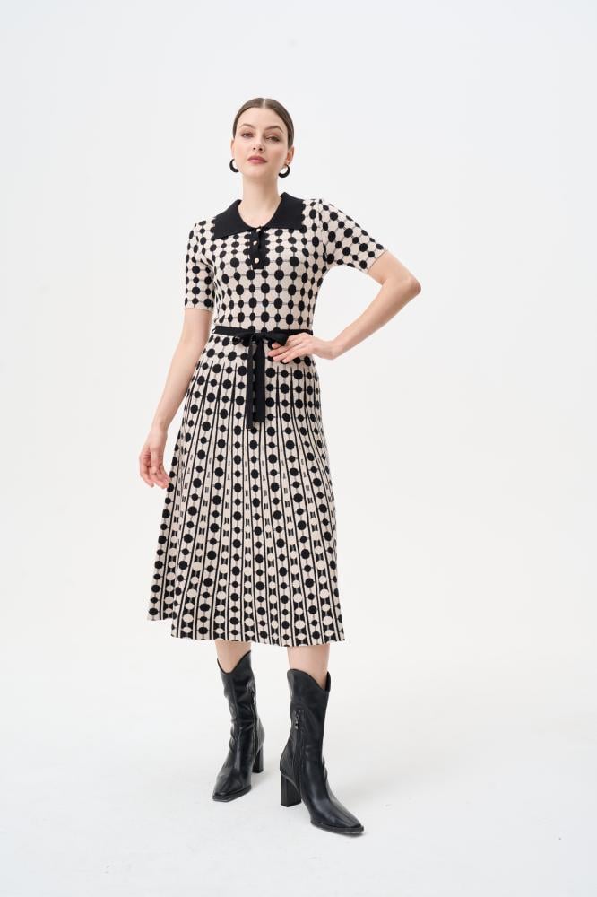 لإطلالة شتوية جذابة ! فستان كلاسيكي مفعم بالأنوثة بقصة على شكل حرف A ،يتميز بياقة مدببة بأزرار للإغلاق ، ومزدان بنقوش هندسية كما يأتي مع حزام ربط