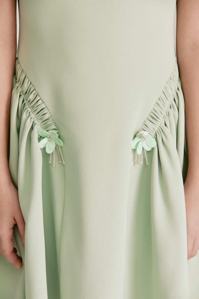 - لون أخضر ناعم: يمنح الفستان حضورًا مميزًا وعصريًا.