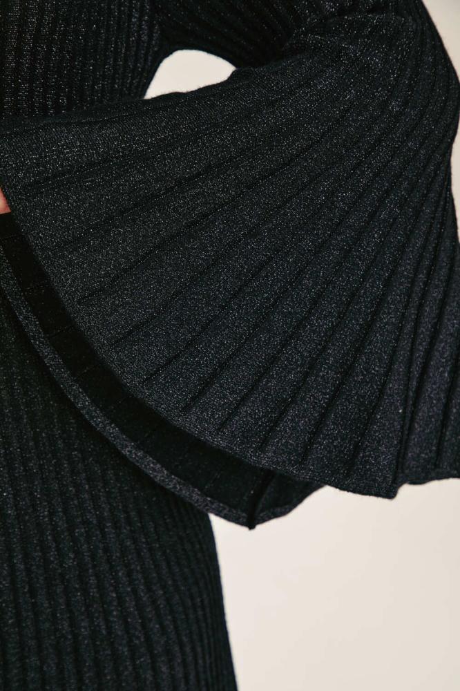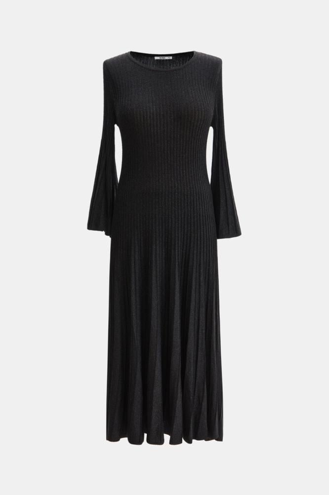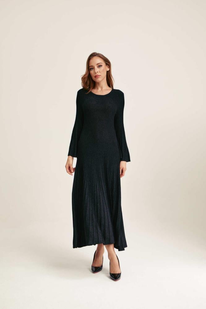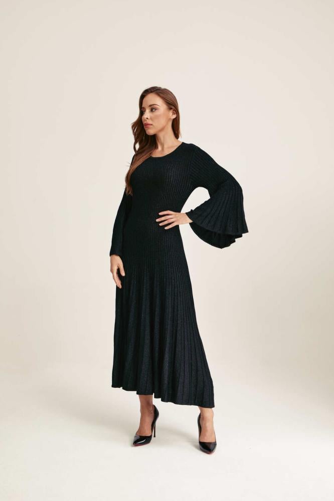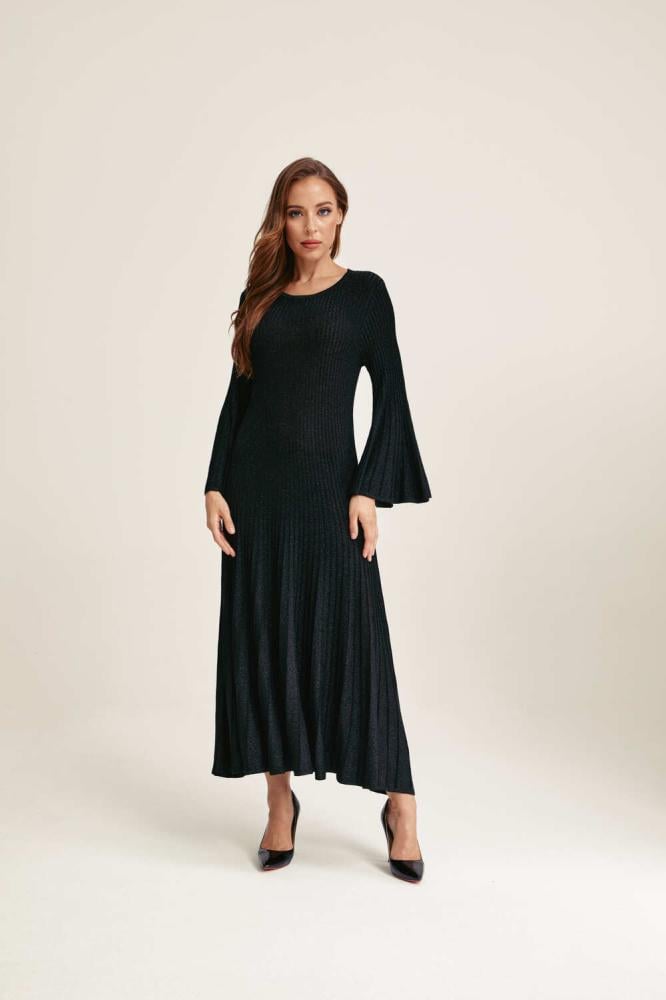 استمتعي بإطلالة راقية وخالدة مع فستان اسود لامع وذلك لأنه يتميز بأناقة وراحة مثالية بأسلوب عصري متجدد، بالإضافة إلى تصميمه بلمسة كلاسيكية مع ياقة مستديرة وأكمام جرس فريدة يعطيكِ مظهر أنثوي ساحر يناسب كل المناسبات، من اللقاءات النهارية إلى الأمسيات الخاصة.