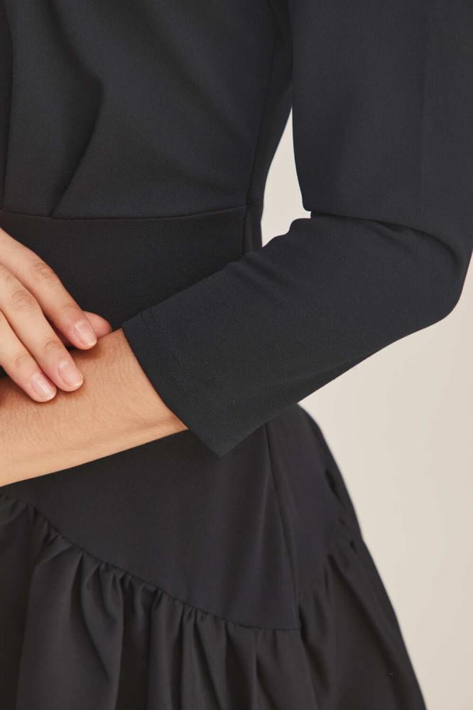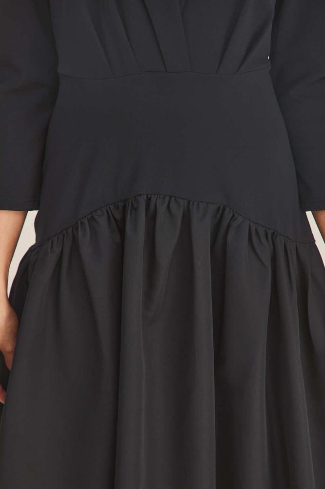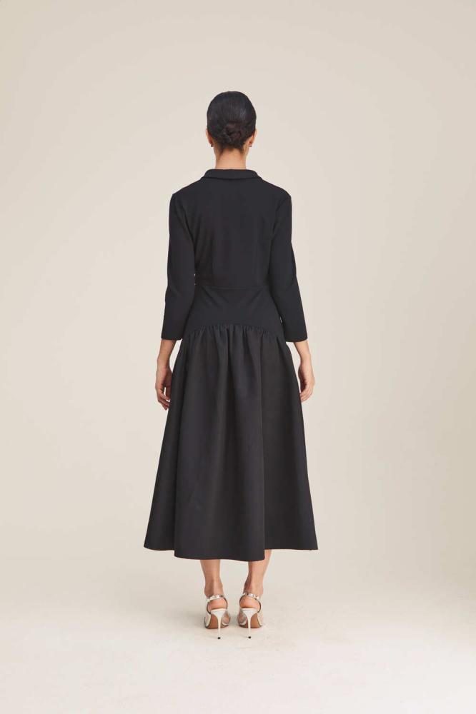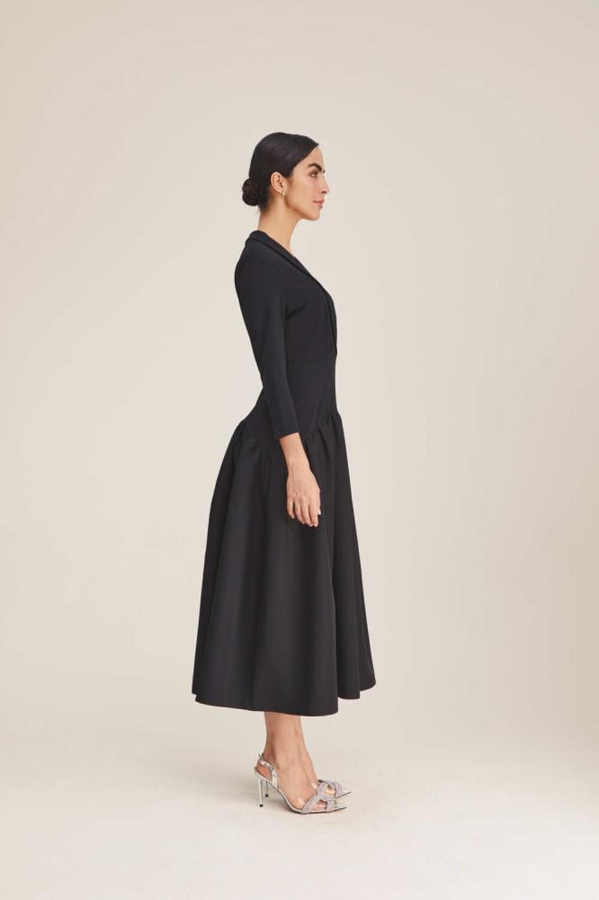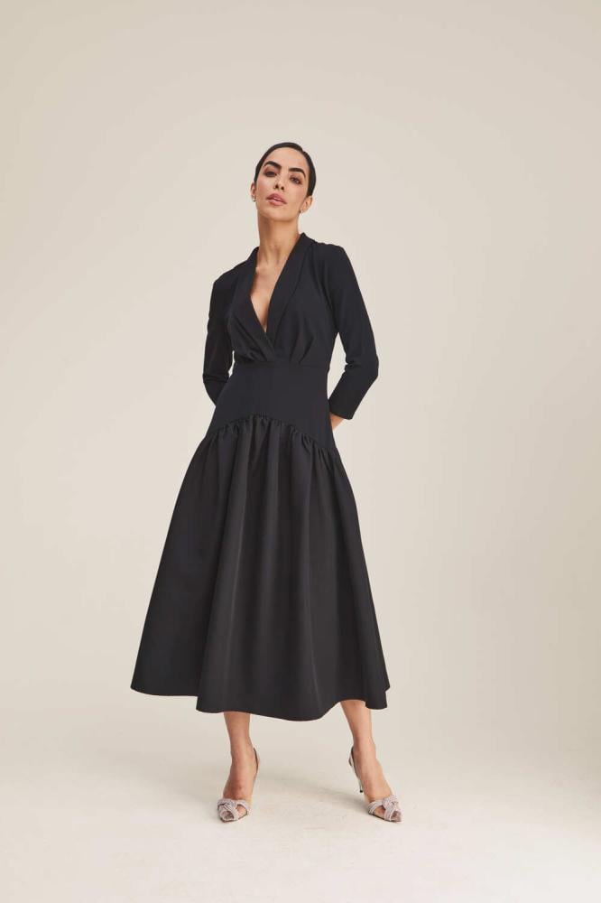 فستان بتصميم مُلفت وطابع بسيط ليمنحك إطلالة راقية، يتميز بخصر منخفض بكسرات ، ويأتي بياقة عصرية وأكمام متوسطة الطول