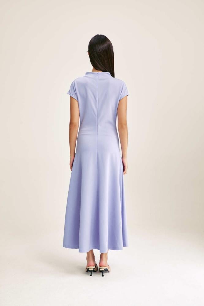 يأتي هذا الفستان الميدي بتصميم يجمع بين الأناقة واللمسات الكلاسيكية ، بتصميم بياقة عالية وبأكمام قصيرة ، ويتميز بخصر ضيقة وقصة على شكل حرف A