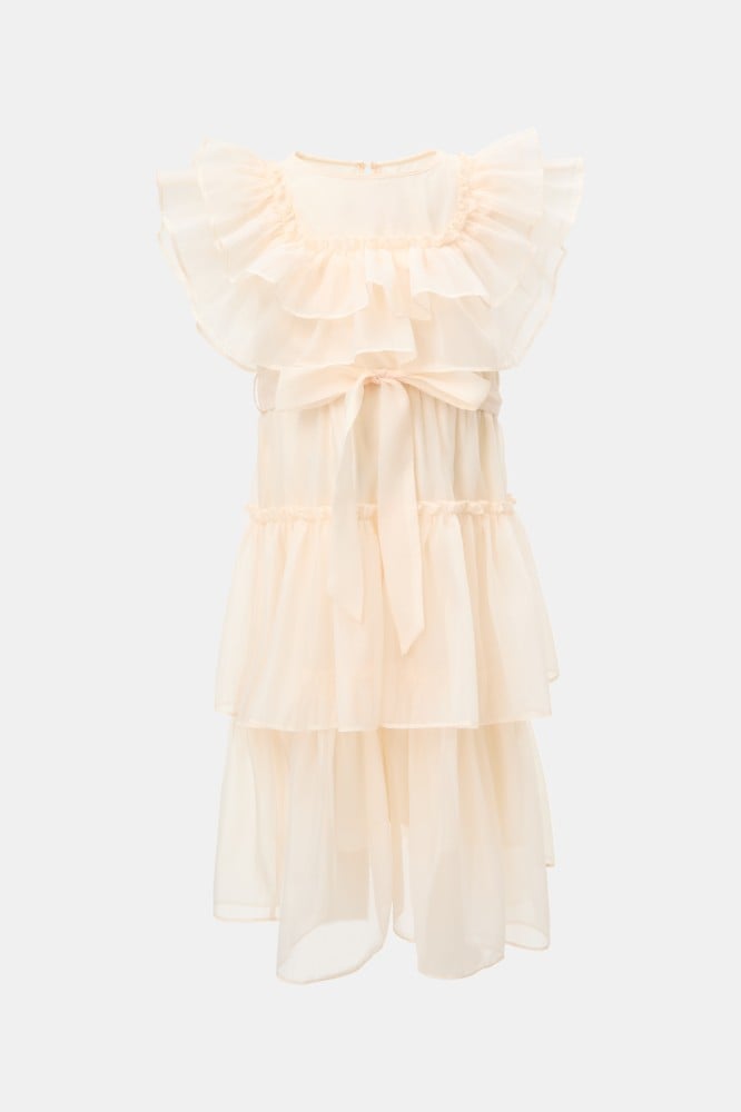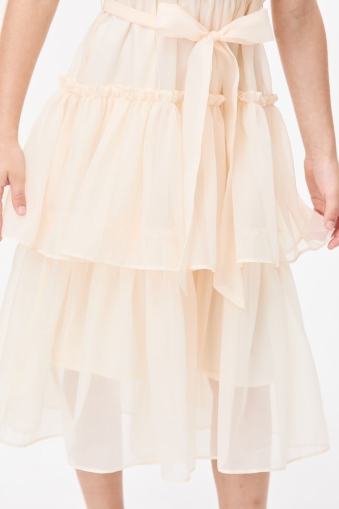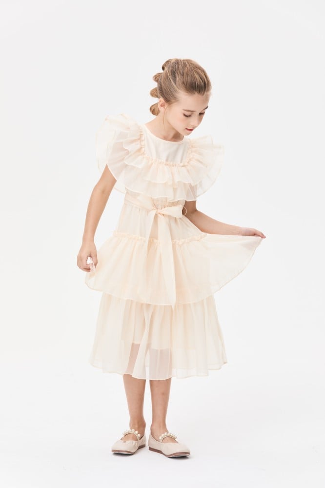 إجعلي صغيرتك تتباهى بأحلى حلة بإطلالتها الجذابة مع هذا الفستان الناعم مصمم بياقة مستديرة وباكمام قصيرة بتفاصيل كشكش ويأتي بقصة طبقات مع حزام ربط