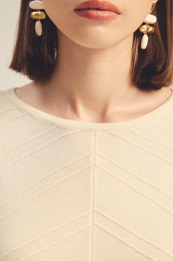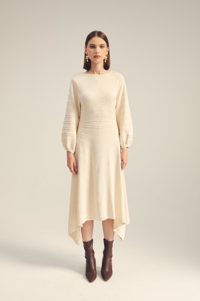 للوك دافئ تألقي بفستان محبوك ومزين بغرز بارزة بقصة ضيقة الخصر تبرز جمال قوامك، ويتميز بأكمام بالون ، وبأطراف غير متماثلة من أسفل .