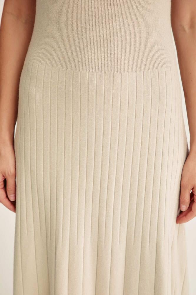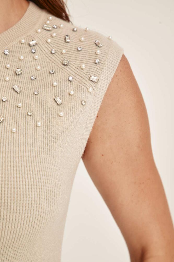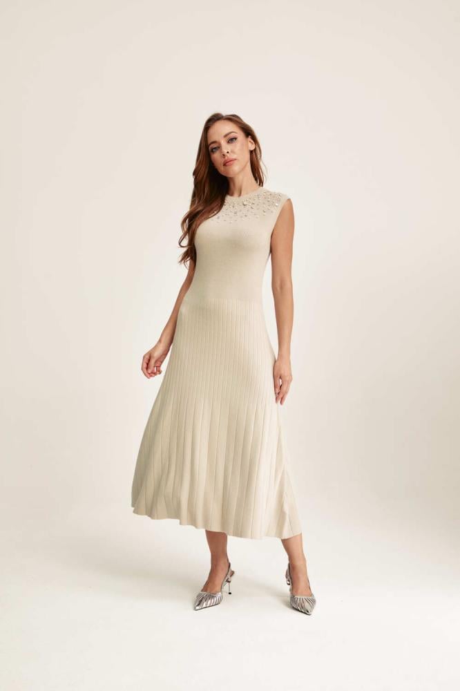 فستان محبوك شتوي بلا أكمام، بياقة مستديرة، يزدان باللؤلؤ والأحجار اللامعة، يمنحك إطلالة آسرة في أمسيات الشتاء.المعلومات الاساسية