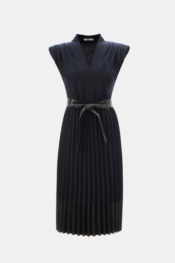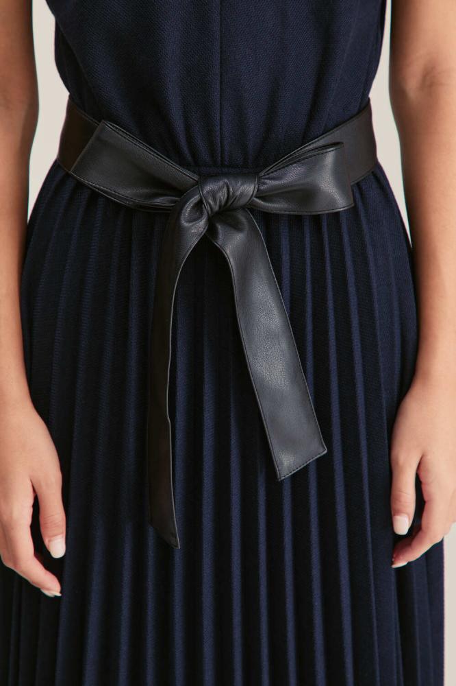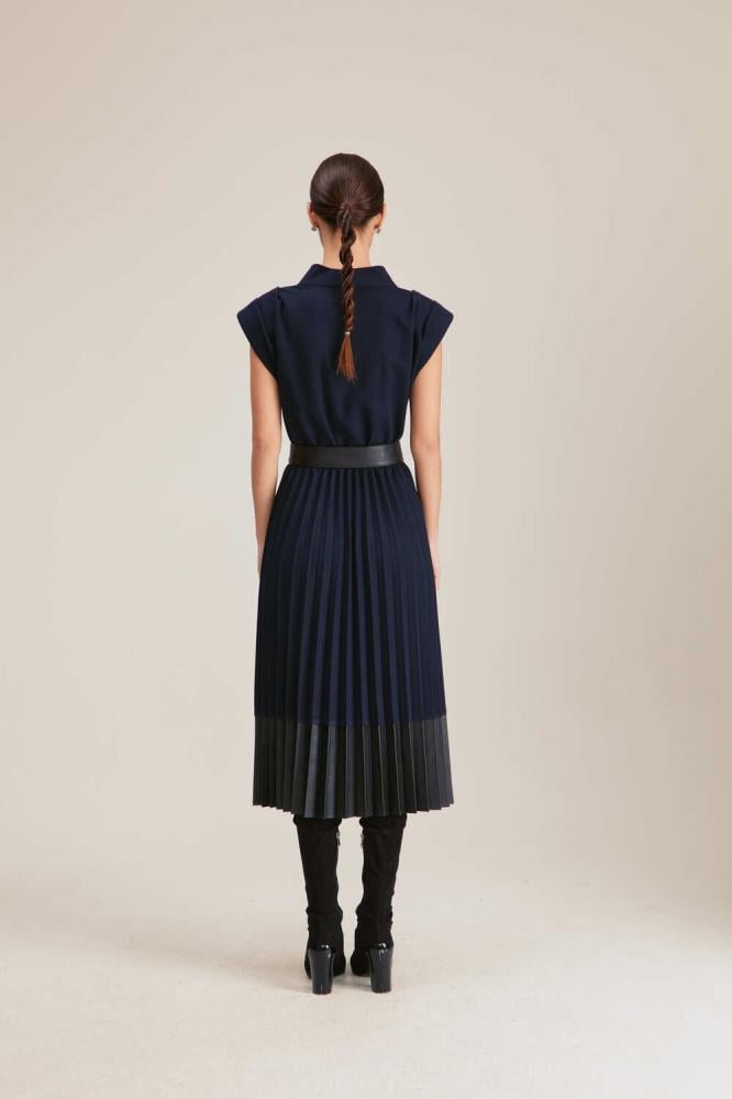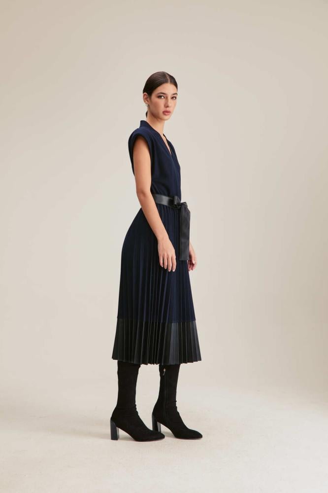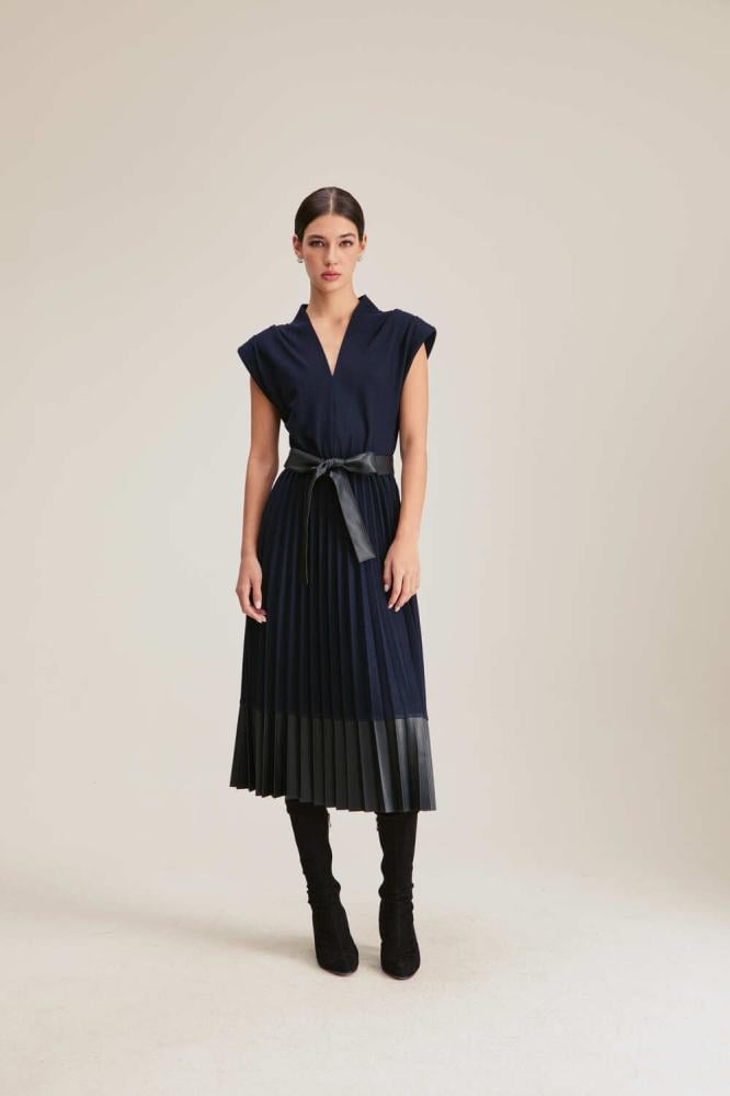 تصميم ينبض بالأنوثة والأناقة ، يتميز هذا الفستان بتصميم محبوك من أعلى وبحواف من الجلد ، بقصة على شكل حرف A ويتميز بأكمام قصيرة وياقة على شكل حرف V كما ويأتي مع حزام جلد ، يناسب إطلالتك المسائية والنهارية.