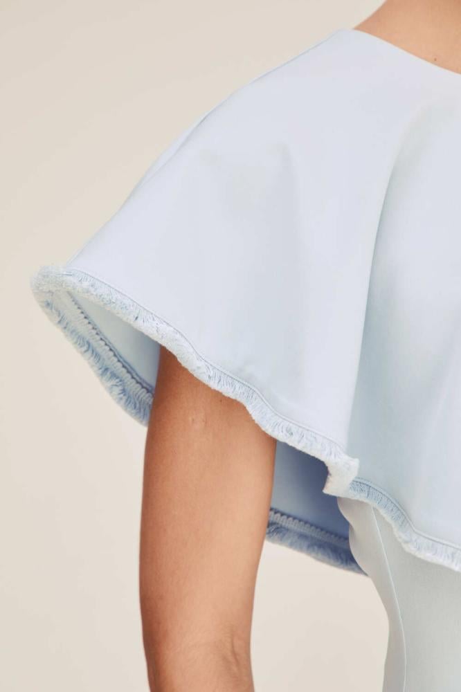 احصلي على إطلالة ملكية ساحرة بفستان يتميز بتصميم بسيط بياقة بنمط كاب بتفاصيل هدب تضفي لمسة راقية على تصميمه الكلاسيكي