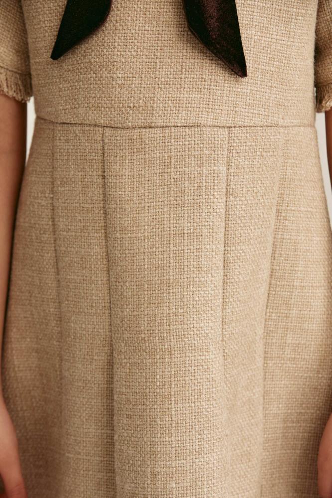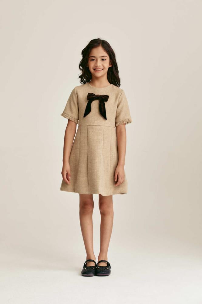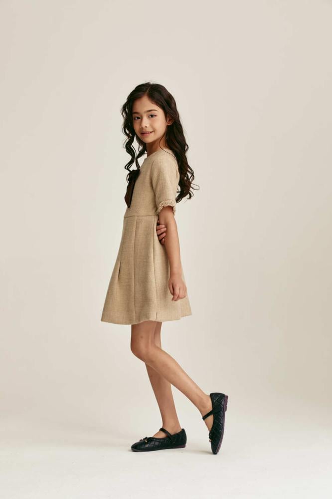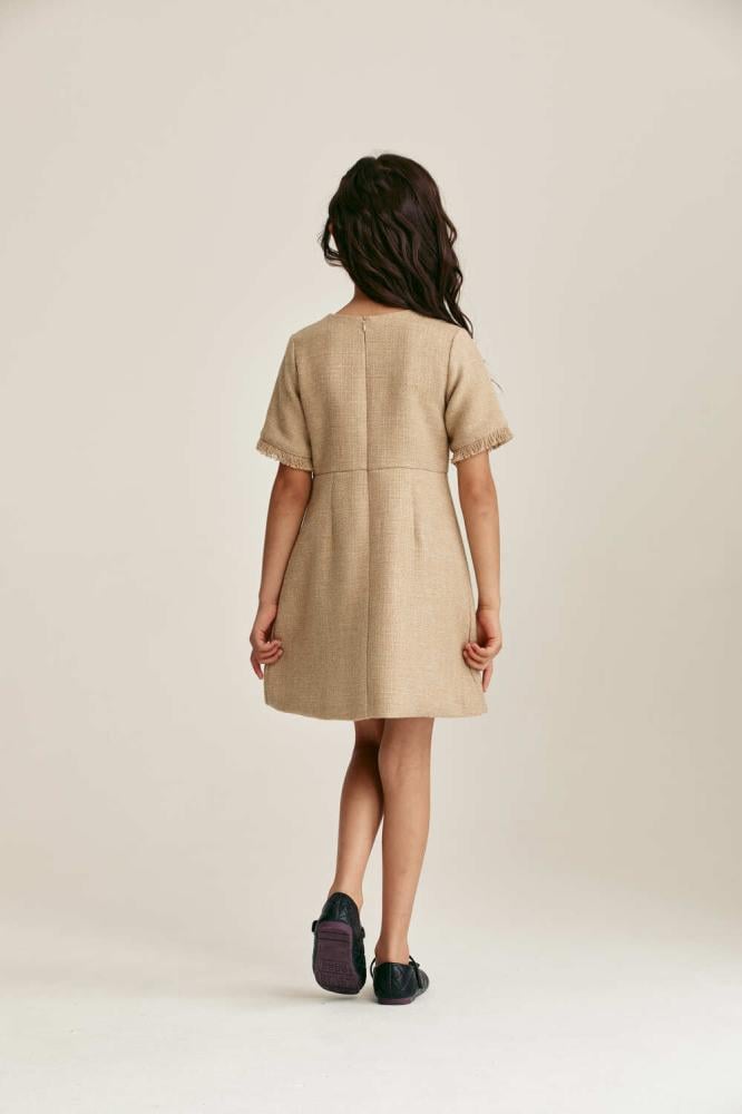 فستان بيج تويد راقٍ بتفاصيل مخملية ناعمة يضفي لمسة كلاسيكية مميزة على إطلالة صغيرتك. يتميز بياقة مستديرة وأكمام قصيرة تمنح مظهراً عصرياً يناسب كل المناسبات. قصته الواسعة من الأسفل تعكس خفة وأناقة مثالية للأطفال.