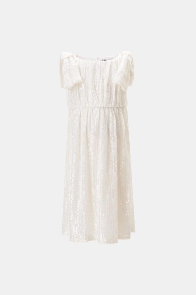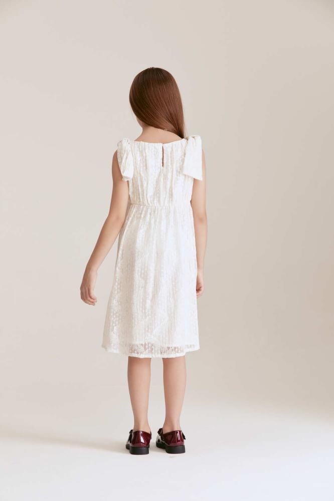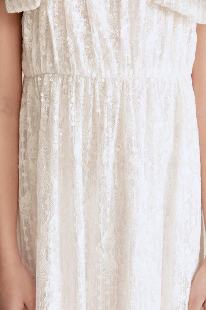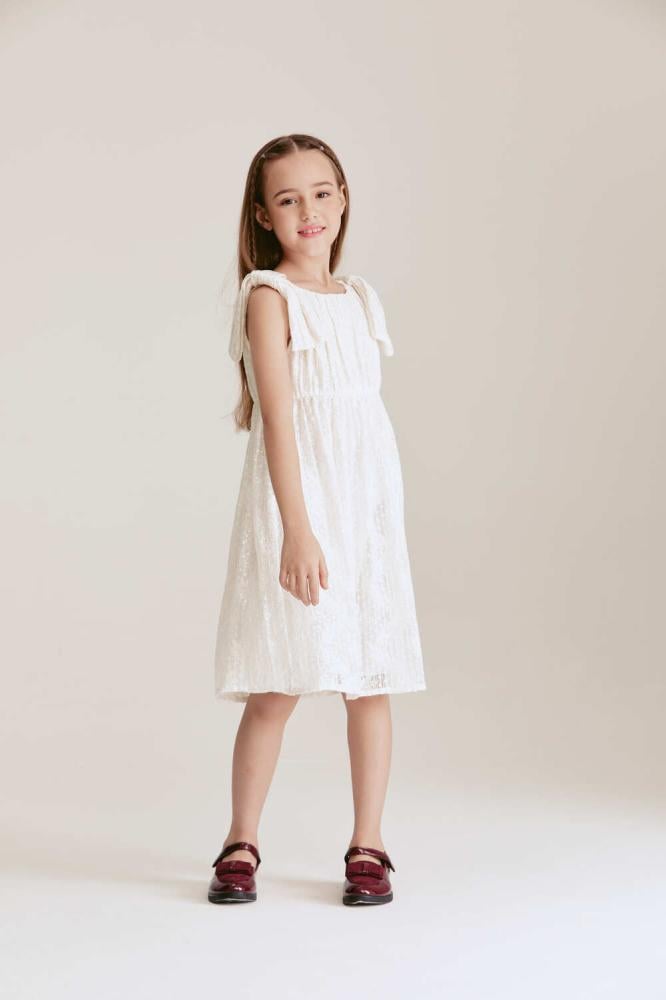فستان بناتي رائع مصنوع من الدانتيل الفاخر، مطرز بالكامل بالترتر اللامع الذي يضيف لمسة من التألق. يتميز بأكتاف مزينة بأربطة