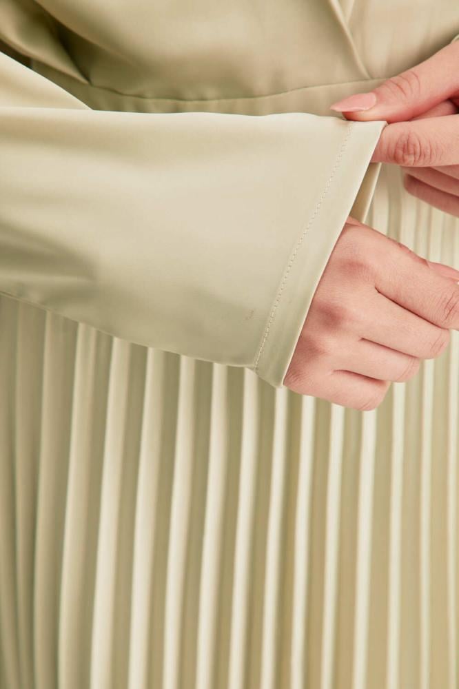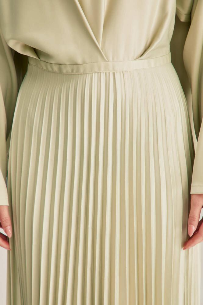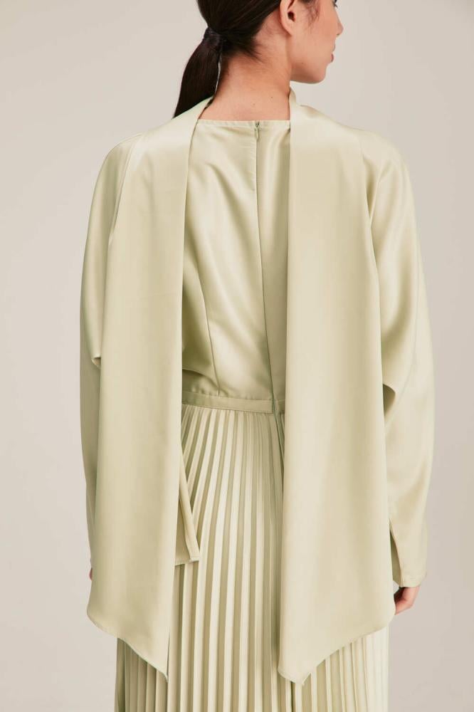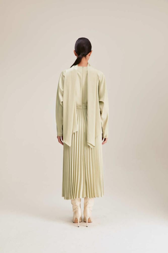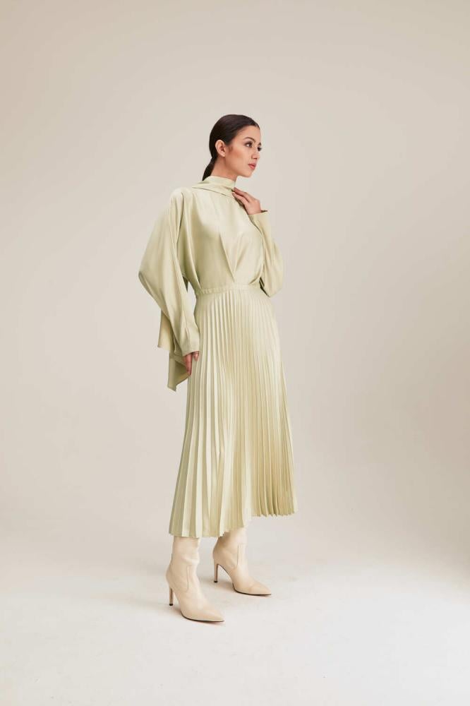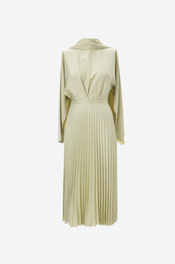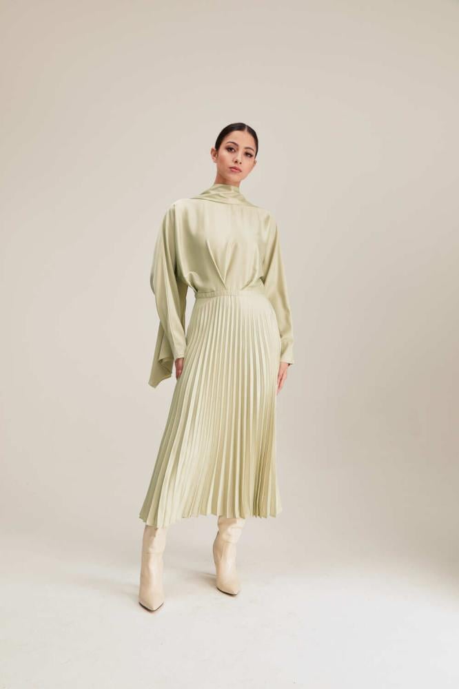 انعمي بإطلالة عصرية أنيقة مع فستان بقصة انسيابية مزينة بوشاح فريد يضفي لمسة فنية على التصميم. يتميز بتفاصيل درابية من أعلى وبتنورة بليسيه
