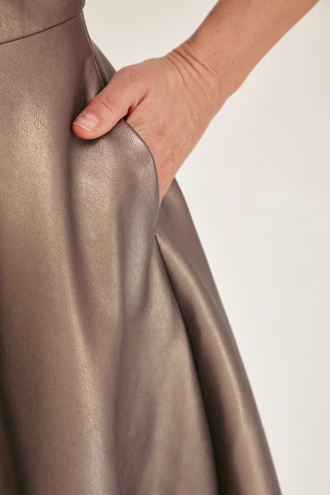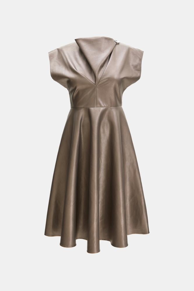 تألقي بإطلالة مميزة واستثنائية مع هذا الفستان بتصميم مصنوع من الجلد الصناعي ،مصمم بقصة كلوش وبياقة غيرمتماثلة ، ارتديه مع حقيبة لامعة لمظهر لا مثيل له.