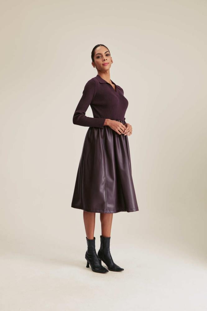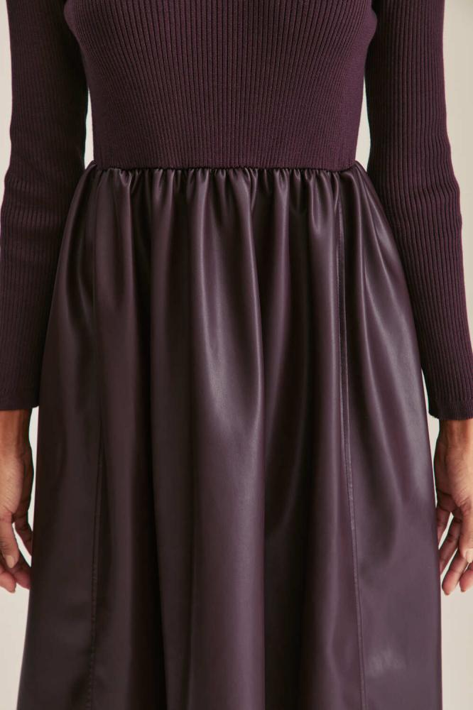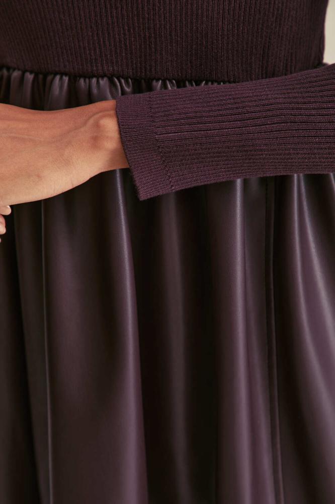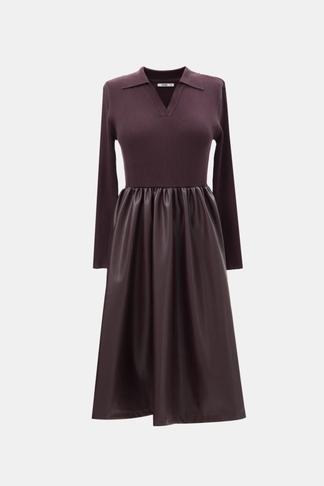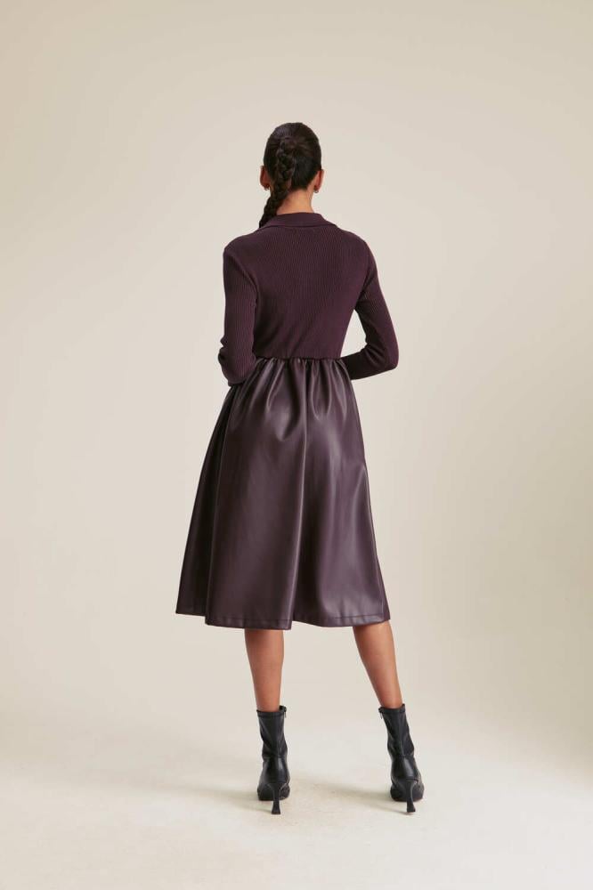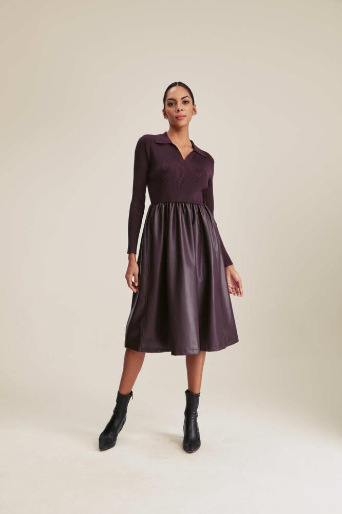 تألقي بفستان ميدي يجمع بين الخامة المحبوكه والجلد ، بياقة V وبأكمام طويلة وبخصر مطاطي بطيات ، تصميم أنثوي بقصة تبرز جمال قوامك بأسلوب معاصر. قطعة مثالية للمناسبات تمنحك حضورًا راقيًا ومتجددًا.