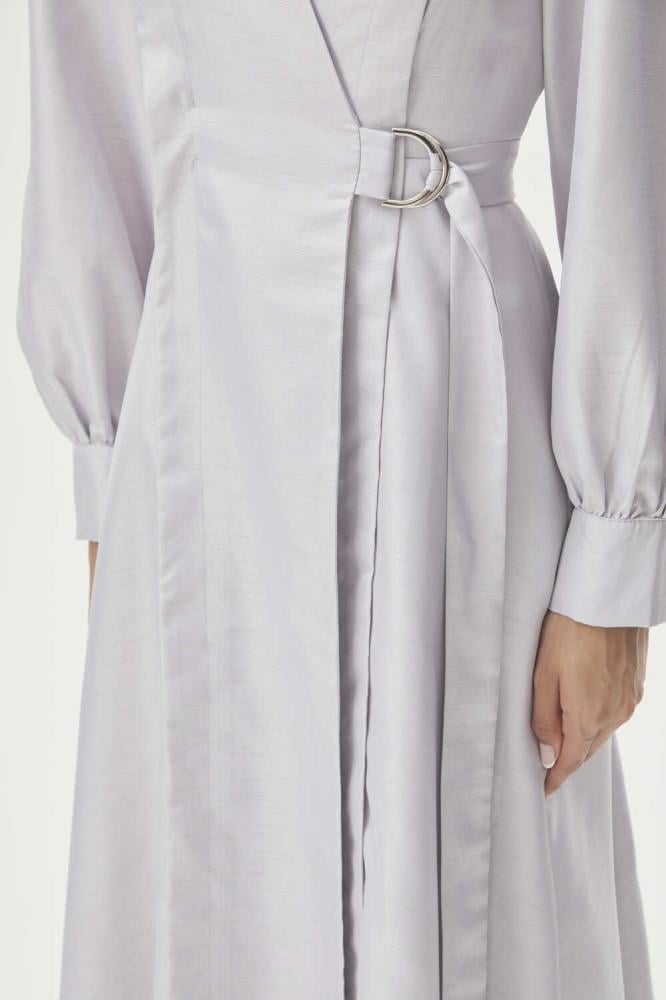 - تصميم كلاسيكي فاخر: يتميز بقصة واسعة وحزام معدني أنيق لإبراز جمال القوام بأسلوب راقٍ.