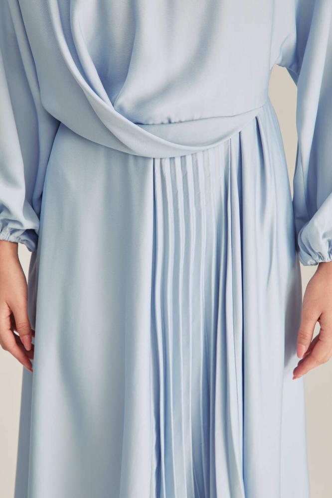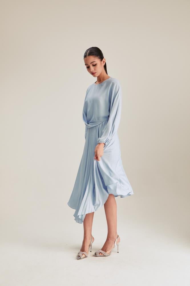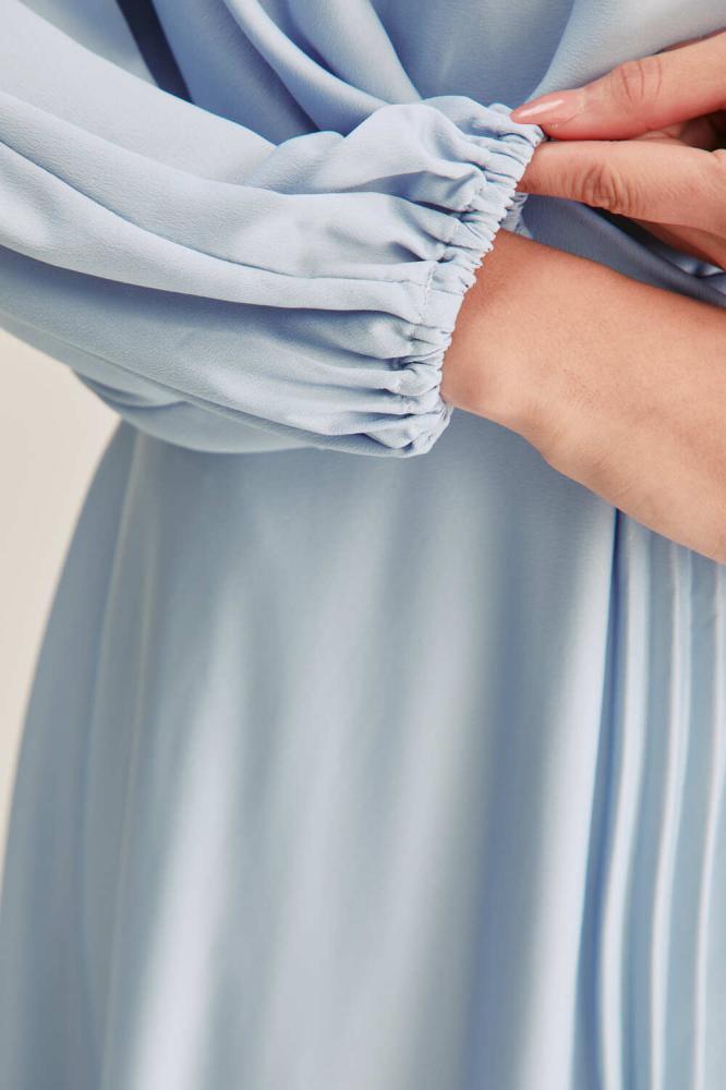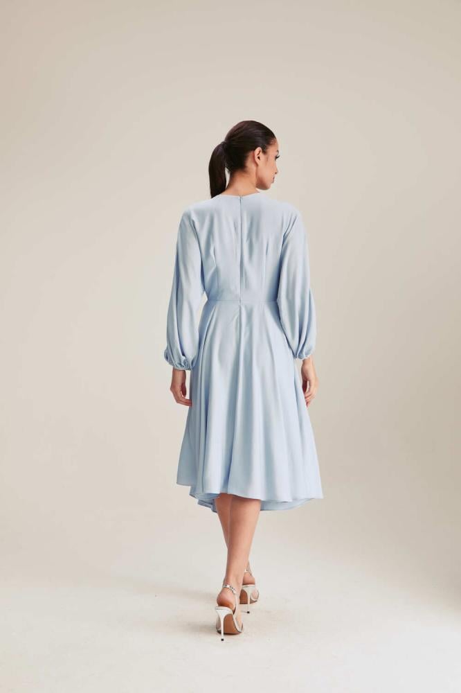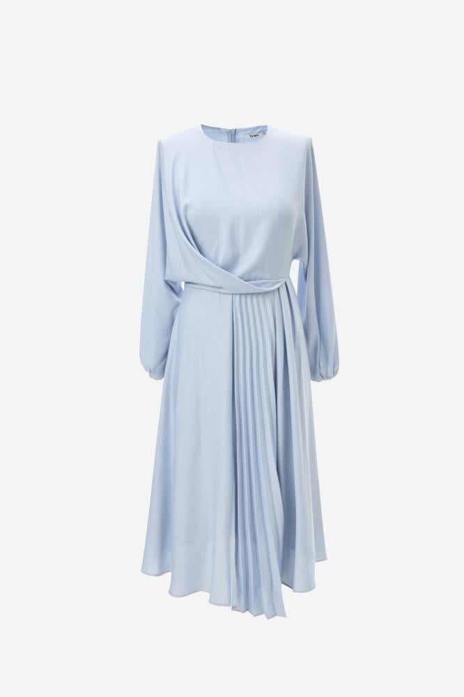 فستان متوسط الطول يتميز بفتحة رقبة مستديرة وبقصة منسدلة تكسبه طابعًا مفعمًا بالأنوثة. كما يتزين بطيات في الأمام ، وبأكمام بأساور مطاطية
