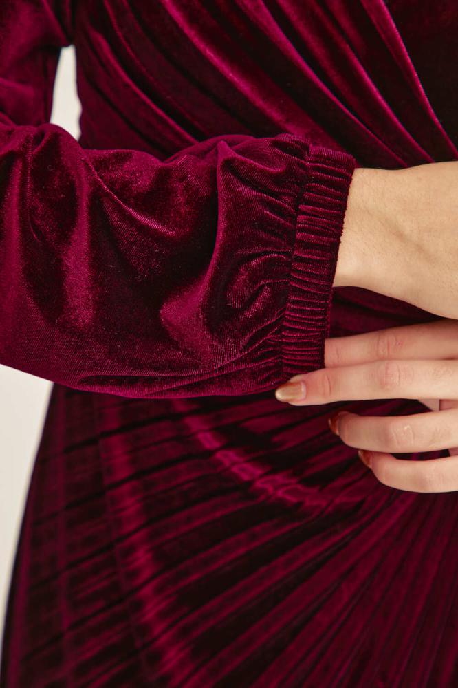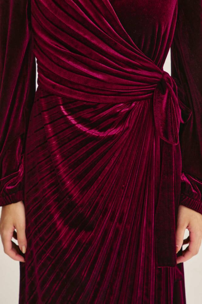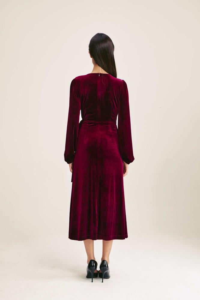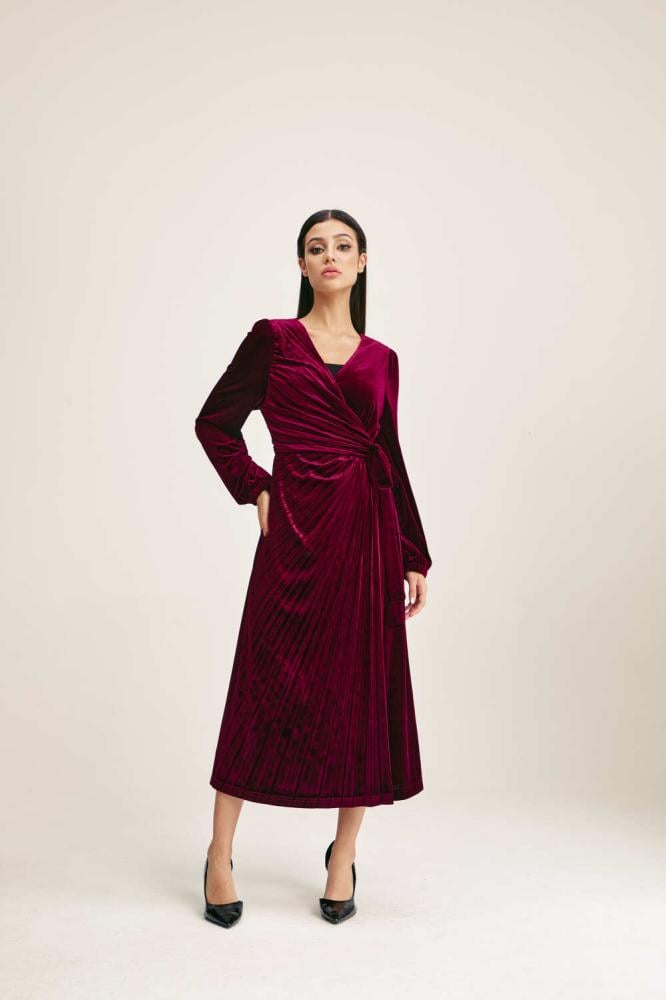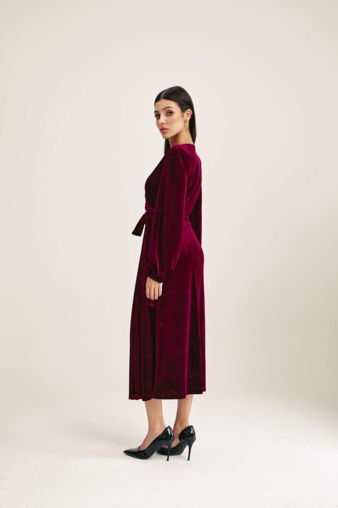 فستان مخمل بلون عنابي دافئ يبرز جاذبيته بتفاصيل فاخرة. تصميم بياقة لف وبرباط وجانبي يضفي لمسة أنثوية راقية. وأكمام بأساور مطاطية تمنح راحة وأناقة في كل لحظة.