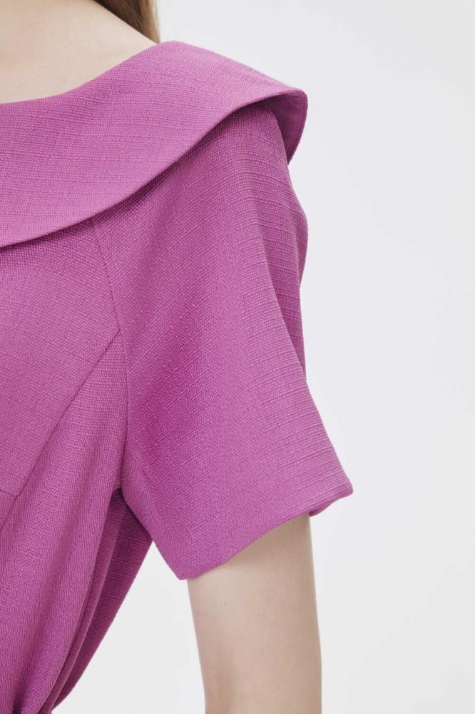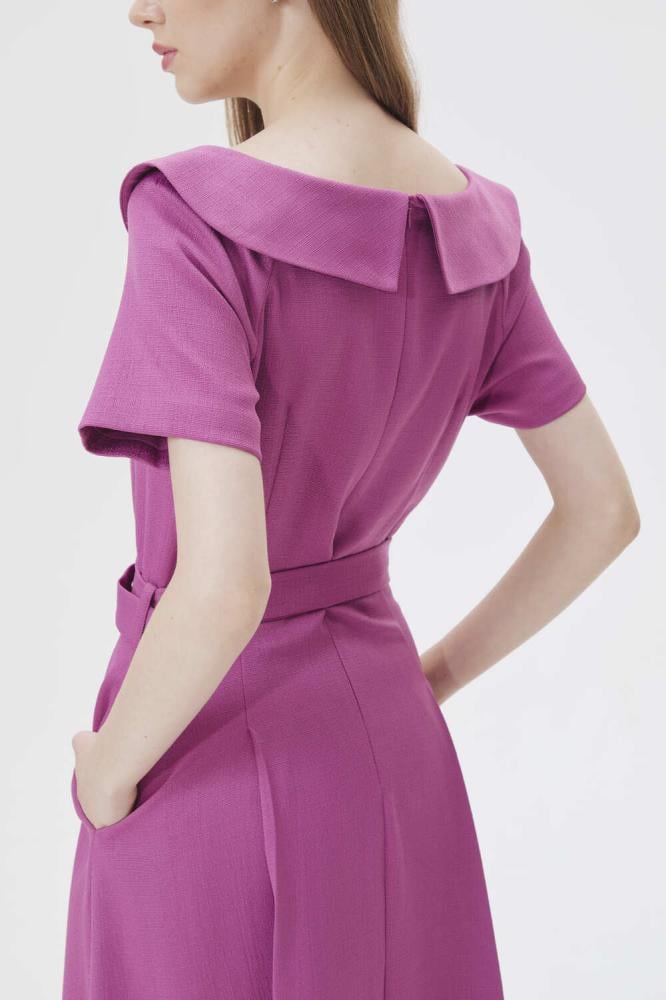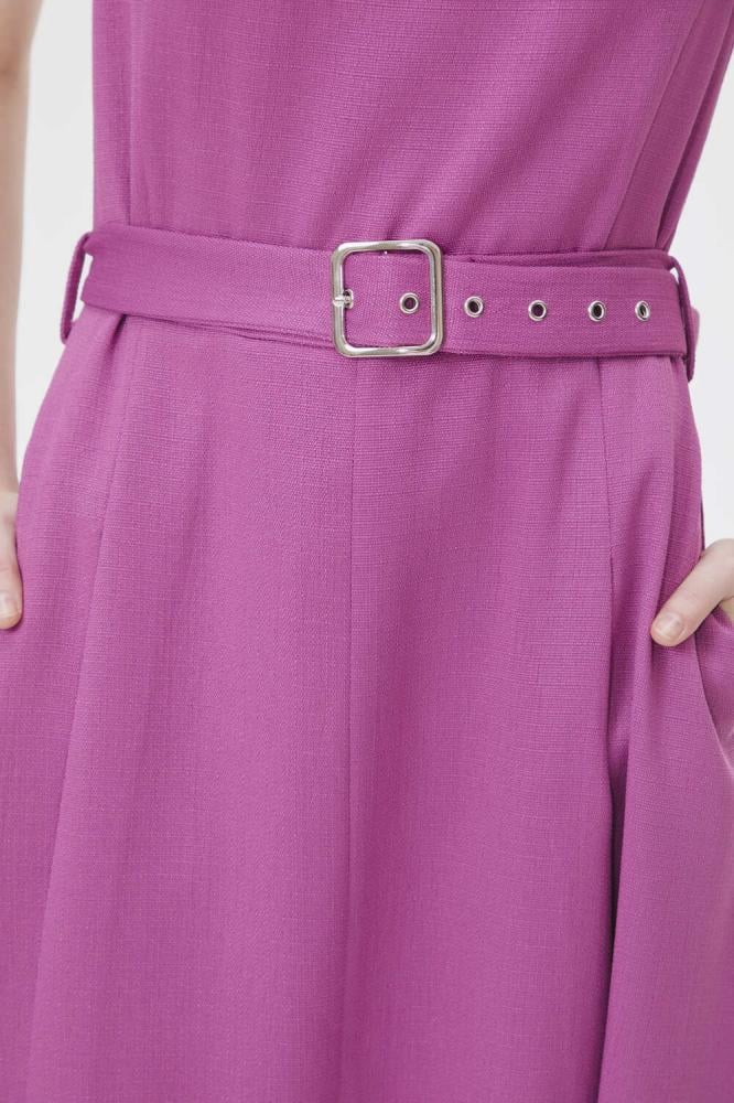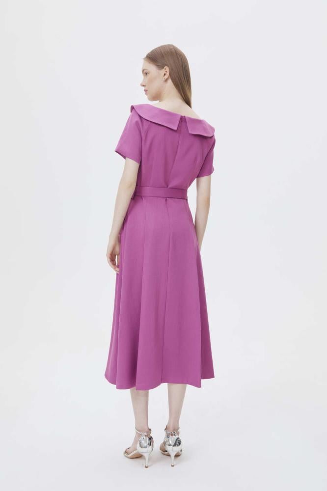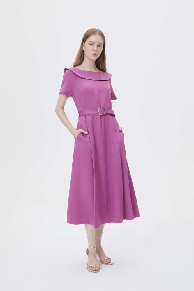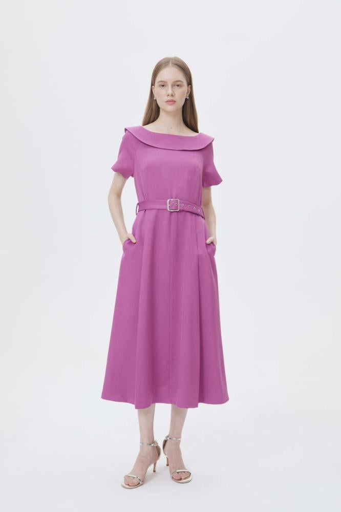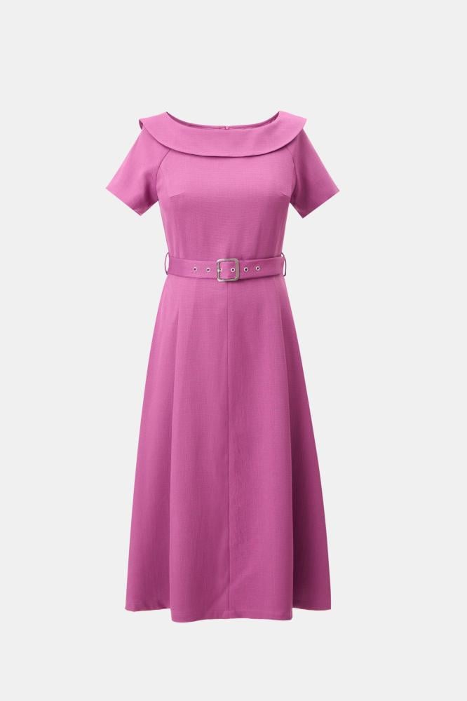 انعمي بإطلالة ساحرة مع فستان مصمم بفتحة رقبة على شكل قارب وخصر ضيق وقصة بسيطة.ومزين بحزام بإبزيم إغلاق