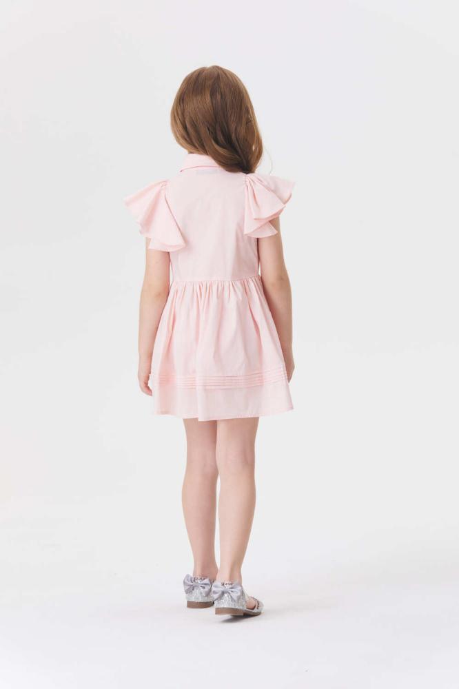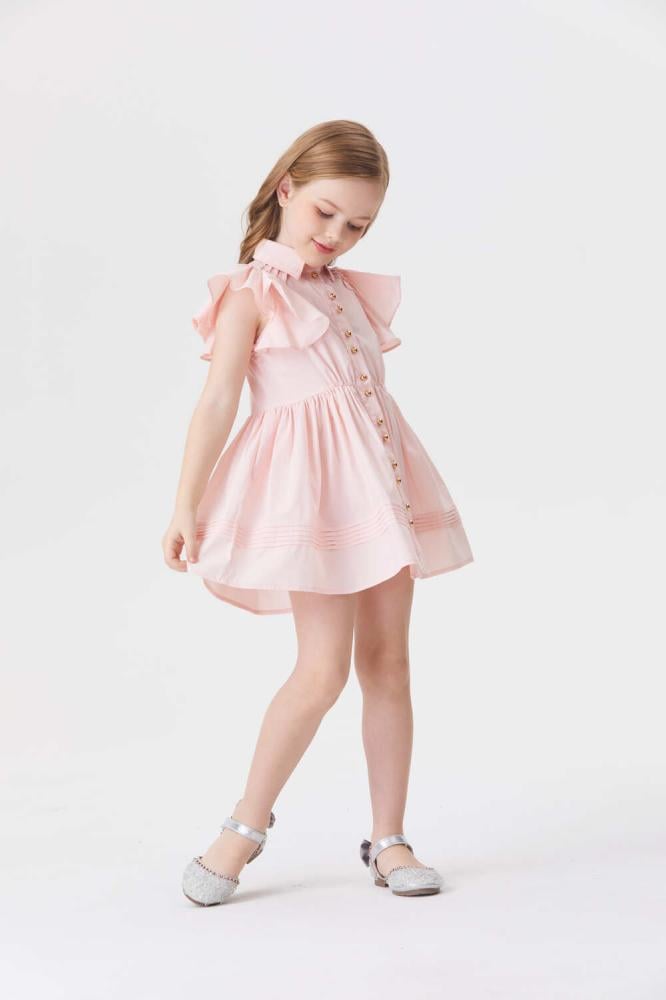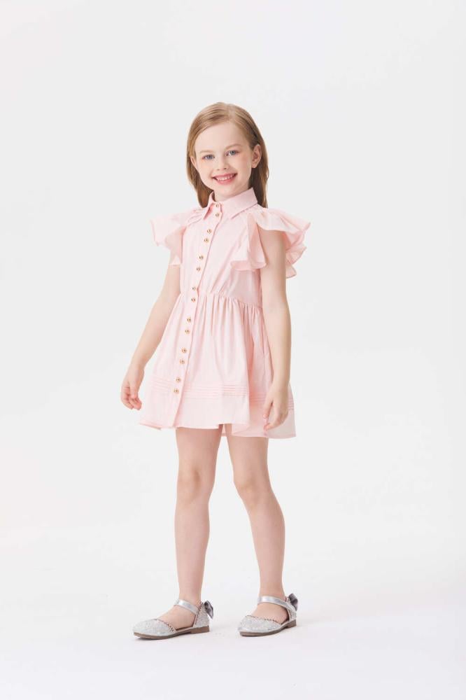 امنحي أميرتك الصغيرة إطلالة أنيقة وجذابة مع هذا الفستان الساحر والمميز بتصميم ناعم بياقة قميص وبأكمام كشكش ويتميز بأزرار ذهبية للإغلاق وبتفاصيل كسرات